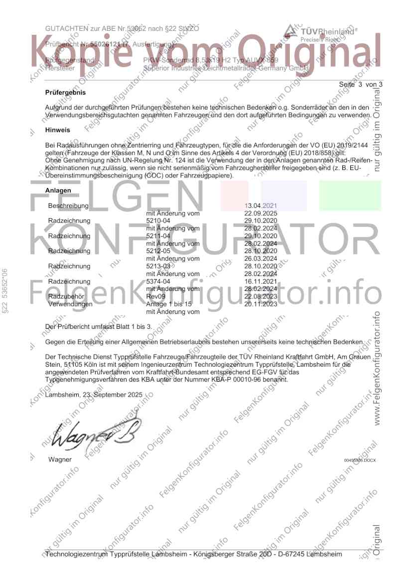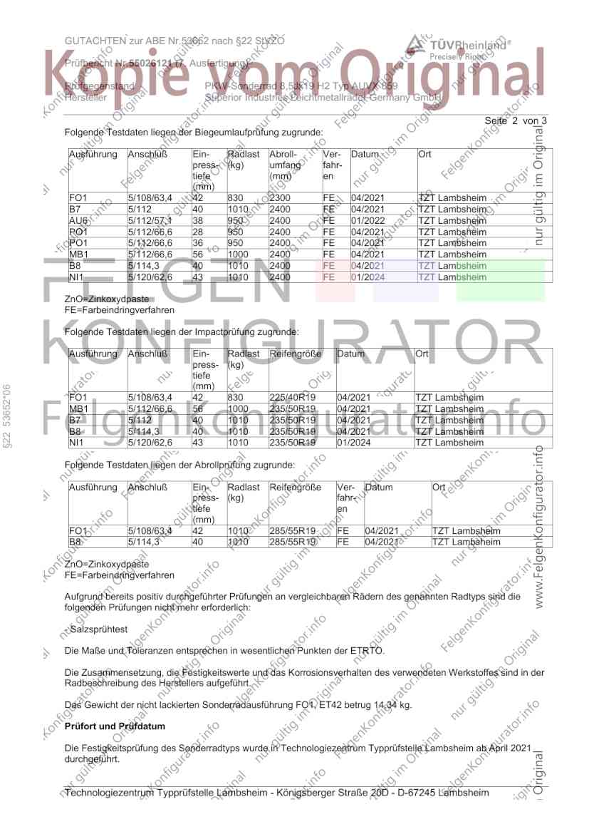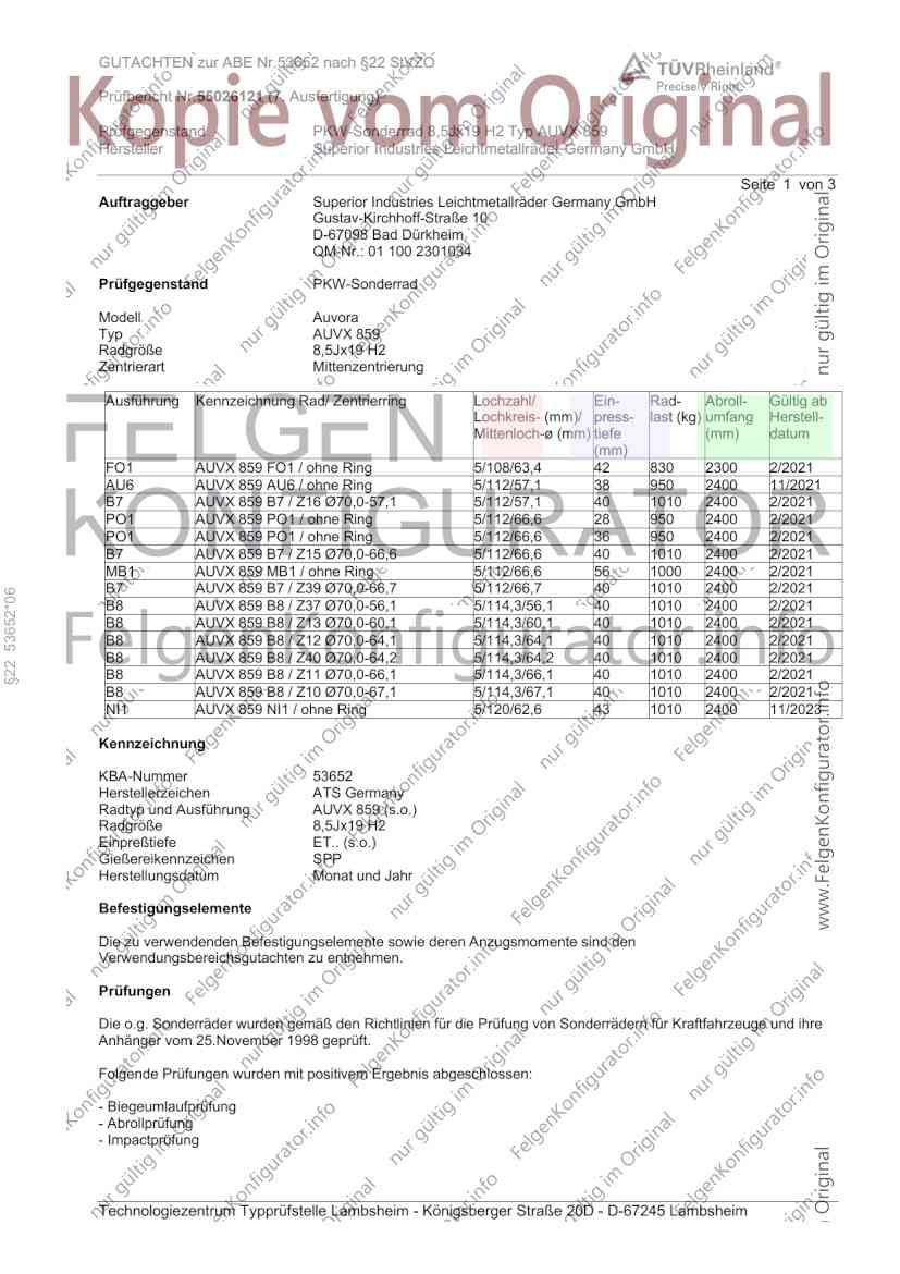 GUTACHTEN zur ABE Nr.53652 nach §22 StVZO Prüfbericht Nr.55026121 (7. Ausfertigung) Prüfgegenstand PKW-Sonderrad 8,5Jx19 H2 Typ AUVX 859 Hersteller Superior Industries Leichtmetallräder Germany GmbH Seite 1 von 3 Auftraggeber Superior Industries Leichtmetallräder Germany GmbH Gustav-Kirchhoff-Straße 10 D-67098 Bad Dürkheim QM-Nr.: 01 100 2301034 Prüfgegenstand PKW-Sonderrad Modell Auvora Typ AUVX 859 Radgröße 8,5Jx19 H2 Zentrierart Mittenzentrierung Ausführung Kennzeichnung Rad/ Zentrierring Lochzahl/ Ein- Rad- Abroll- Gültig ab Lochkreis- (mm)/ press- last (kg) umfang Herstell- Mittenloch-ø (mm) tiefe (mm) datum (mm) FO1 AUVX 859 FO1 / ohne Ring 5/108/63,4 42 830 2300 2/2021 AU6 AUVX 859 AU6 / ohne Ring 5/112/57,1 38 950 2400 11/2021 B7 AUVX 859 B7 / Z16 Ø70,0-57,1 5/112/57,1 40 1010 2400 2/2021 PO1 AUVX 859 PO1 / ohne Ring 5/112/66,6 28 950 2400 2/2021 PO1 AUVX 859 PO1 / ohne Ring 5/112/66,6 36 950 2400 2/2021 B7 AUVX 859 B7 / Z15 Ø70,0-66,6 5/112/66,6 40 1010 2400 2/2021 MB1 AUVX 859 MB1 / ohne Ring 5/112/66,6 56 1000 2400 2/2021 B7 AUVX 859 B7 / Z39 Ø70,0-66,7 5/112/66,7 40 1010 2400 2/2021 §22 53652*06 B8 AUVX 859 B8 / Z37 Ø70,0-56,1 5/114,3/56,1 40 1010 2400 2/2021 B8 AUVX 859 B8 / Z13 Ø70,0-60,1 5/114,3/60,1 40 1010 2400 2/2021 B8 AUVX 859 B8 / Z12 Ø70,0-64,1 5/114,3/64,1 40 1010 2400 2/2021 B8 AUVX 859 B8 / Z40 Ø70,0-64,2 5/114,3/64,2 40 1010 2400 2/2021 B8 AUVX 859 B8 / Z11 Ø70,0-66,1 5/114,3/66,1 40 1010 2400 2/2021 B8 AUVX 859 B8 / Z10 Ø70,0-67,1 5/114,3/67,1 40 1010 2400 2/2021 NI1 AUVX 859 NI1 / ohne Ring 5/120/62,6 43 1010 2400 11/2023 Kennzeichnung KBA-Nummer 53652 Herstellerzeichen ATS Germany Radtyp und Ausführung AUVX 859 (s.o.) Radgröße 8,5Jx19 H2 Einpreßtiefe ET.. (s.o.) Gießereikennzeichen SPP Herstellungsdatum Monat und Jahr Befestigungselemente Die zu verwendenden Befestigungselemente sowie deren Anzugsmomente sind den Verwendungsbereichsgutachten zu entnehmen. Prüfungen Die o.g. Sonderräder wurden gemäß den Richtlinien für die Prüfung von Sonderrädern für Kraftfahrzeuge und ihre Anhänger vom 25.November 1998 geprüft. Folgende Prüfungen wurden mit positivem Ergebnis abgeschlossen: - Biegeumlaufprüfung - Abrollprüfung - Impactprüfung Technologiezentrum Typprüfstelle Lambsheim - Königsberger Straße 20D - D-67245 Lambsheim GUTACHTEN zur ABE Nr.53652 nach §22 StVZO Prüfbericht Nr.55026121 (7. Ausfertigung) Prüfgegenstand PKW-Sonderrad 8,5Jx19 H2 Typ AUVX 859 Hersteller Superior Industries Leichtmetallräder Germany GmbH Seite 2 von 3 Folgende Testdaten liegen der Biegeumlaufprüfung zugrunde: Ausführung Anschluß Ein- Radlast Abroll- Ver- Datum Ort press- (kg) umfang fahr- tiefe (mm) en (mm) FO1 5/108/63,4 42 830 2300 FE 04/2021 TZT Lambsheim B7 5/112 40 1010 2400 FE 04/2021 TZT Lambsheim AU6 5/112/57,1 38 950 2400 FE 01/2022 TZT Lambsheim PO1 5/112/66,6 28 950 2400 FE 04/2021 TZT Lambsheim PO1 5/112/66,6 36 950 2400 FE 04/2021 TZT Lambsheim MB1 5/112/66,6 56 1000 2400 FE 04/2021 TZT Lambsheim B8 5/114,3 40 1010 2400 FE 04/2021 TZT Lambsheim NI1 5/120/62,6 43 1010 2400 FE 01/2024 TZT Lambsheim ZnO=Zinkoxydpaste FE=Farbeindringverfahren Folgende Testdaten liegen der Impactprüfung zugrunde: Ausführung Anschluß Ein- Radlast Reifengröße Datum Ort press- (kg) tiefe (mm) §22 53652*06 FO1 5/108/63,4 42 830 225/40R19 04/2021 TZT Lambsheim MB1 5/112/66,6 56 1000 235/50R19 04/2021 TZT Lambsheim B7 5/112 40 1010 235/50R19 04/2021 TZT Lambsheim B8 5/114,3 40 1010 235/50R19 04/2021 TZT Lambsheim NI1 5/120/62,6 43 1010 235/50R19 01/2024 TZT Lambsheim Folgende Testdaten liegen der Abrollprüfung zugrunde: Ausführung Anschluß Ein- Radlast Reifengröße Ver- Datum Ort press- (kg) fahr- tiefe en (mm) FO1 5/108/63,4 42 1010 285/55R19 FE 04/2021 TZT Lambsheim B8 5/114,3 40 1010 285/55R19 FE 04/2021 TZT Lambsheim ZnO=Zinkoxydpaste FE=Farbeindringverfahren Aufgrund bereits positiv durchgeführter Prüfungen an vergleichbaren Rädern des genannten Radtyps sind die folgenden Prüfungen nicht mehr erforderlich: - Salzsprühtest Die Maße und Toleranzen entsprechen in wesentlichen Punkten der ETRTO. Die Zusammensetzung, die Festigkeitswerte und das Korrosionsverhalten des verwendeten Werkstoffes sind in der Radbeschreibung des Herstellers aufgeführt. Das Gewicht der nicht lackierten Sonderradausführung FO1, ET42 betrug 14,34 kg. Prüfort und Prüfdatum Die Festigkeitsprüfung des Sonderradtyps wurde in Technologiezentrum Typprüfstelle Lambsheim ab April 2021 durchgeführt. Technologiezentrum Typprüfstelle Lambsheim - Königsberger Straße 20D - D-67245 Lambsheim GUTACHTEN zur ABE Nr.53652 nach §22 StVZO Prüfbericht Nr.55026121 (7. Ausfertigung) Prüfgegenstand PKW-Sonderrad 8,5Jx19 H2 Typ AUVX 859 Hersteller Superior Industries Leichtmetallräder Germany GmbH Seite 3 von 3 Prüfergebnis Aufgrund der durchgeführten Prüfungen bestehen keine technischen Bedenken o.g. Sonderräder an den in den Verwendungsbereichsgutachten genannten Fahrzeugen und den dort aufgeführten Bedingungen zu verwenden. Hinweis Bei Radausführungen ohne Zentrierring und Fahrzeugtypen, für die die Anforderungen der VO (EU) 2019/2144 gelten (Fahrzeuge der Klassen M, N und O im Sinne des Artikels 4 der Verordnung (EU) 2018/858) gilt: Ohne Genehmigung nach UN-Regelung Nr. 124 ist die Verwendung der in den Anlagen genannten Rad-/Reifen- Kombinationen nur zulässig, wenn sie nicht serienmäßig vom Fahrzeughersteller freigegeben sind (z. B. EU- Übereinstimmungsbescheinigung (COC) oder Fahrzeugpapiere). Anlagen Beschreibung 13.04.2021 mit Änderung vom 22.09.2025 Radzeichnung 5210-04 29.10.2020 mit Änderung vom 28.02.2024 Radzeichnung 5211-04 29.10.2020 mit Änderung vom 28.02.2024 Radzeichnung 5212-05 28.10.2020 mit Änderung vom 26.03.2024 Radzeichnung 5213-03 28.10.2020 §22 53652*06 mit Änderung vom 28.02.2024 Radzeichnung 5374-04 16.11.2021 mit Änderung vom 28.02.2024 Radzubehör Rev09 22.08.2023 Verwendungen Anlage 1 bis 15 20.11.2023 mit Änderung vom De
