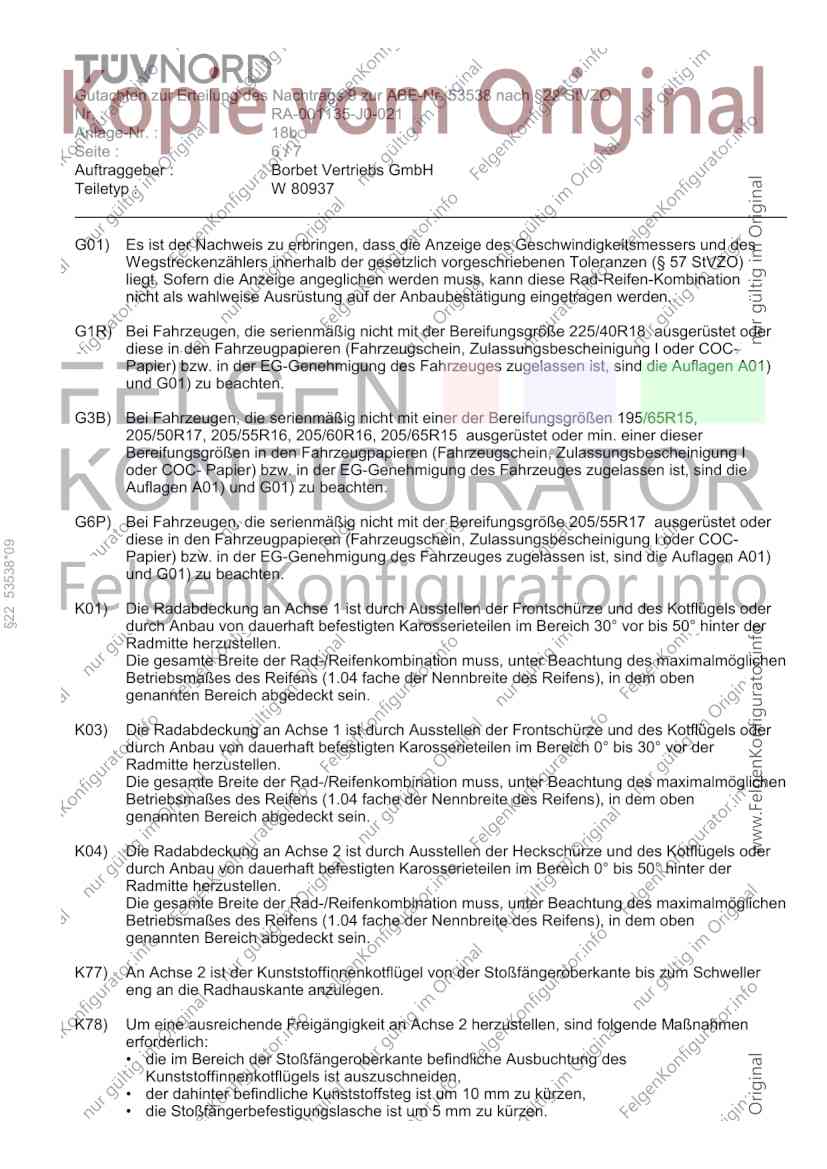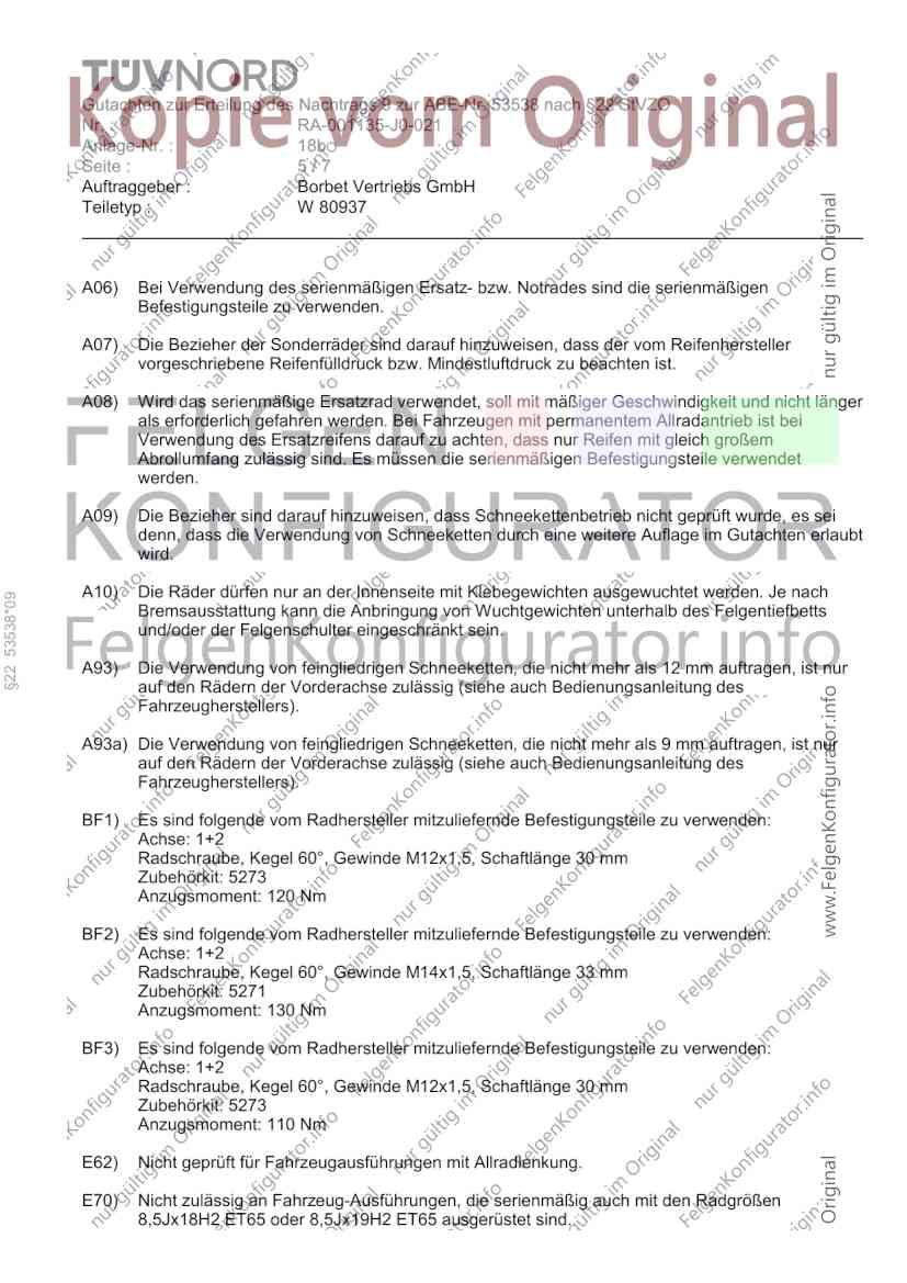 Die Anlage 18b mit den Seiten 1-7 hat nur Gültigkeit in Verbindung mit dem Gutachten für Sonderräder