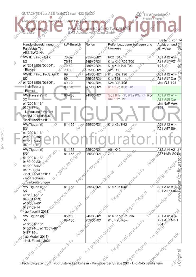 255/45R19 bzw. 8,5x20, ET38 mit 255/40R20 (u.a. Fahrzeugschein, Zulassungsbescheinigung I, COC-Papier