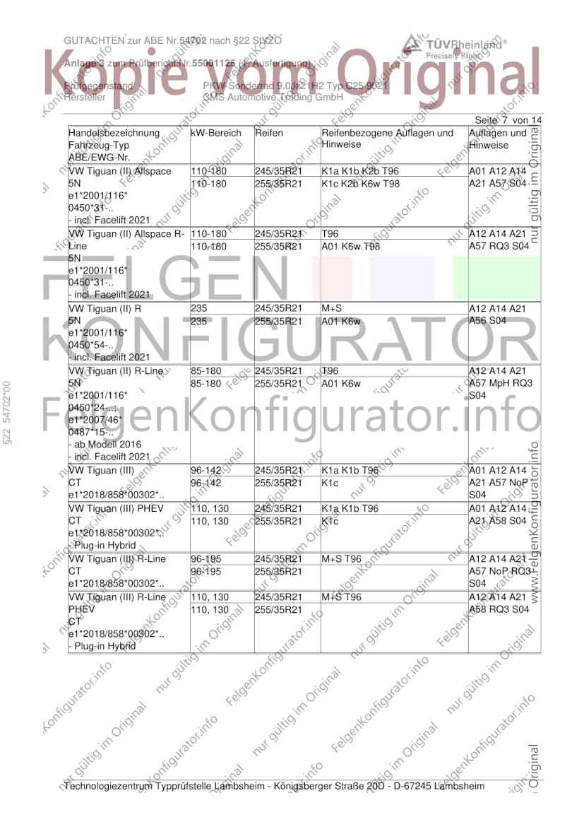 und/oder breiteren Reifengrößen (u. a. Fahrzeugschein, Zulassungsbescheinigung I, COC-Papier oder