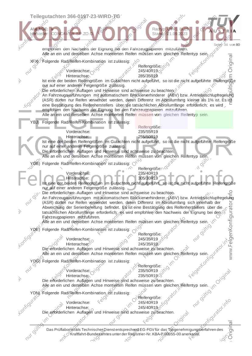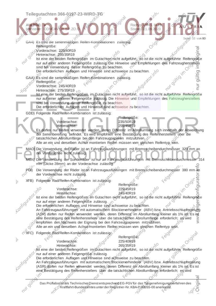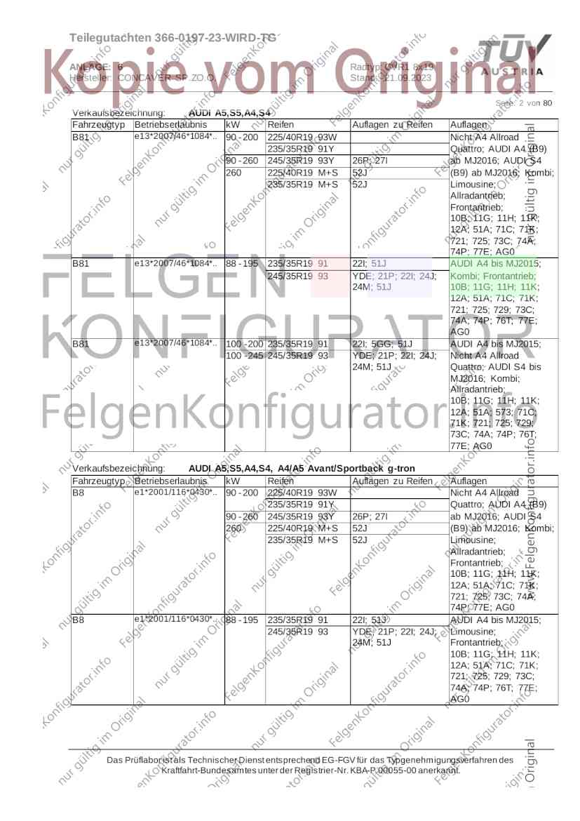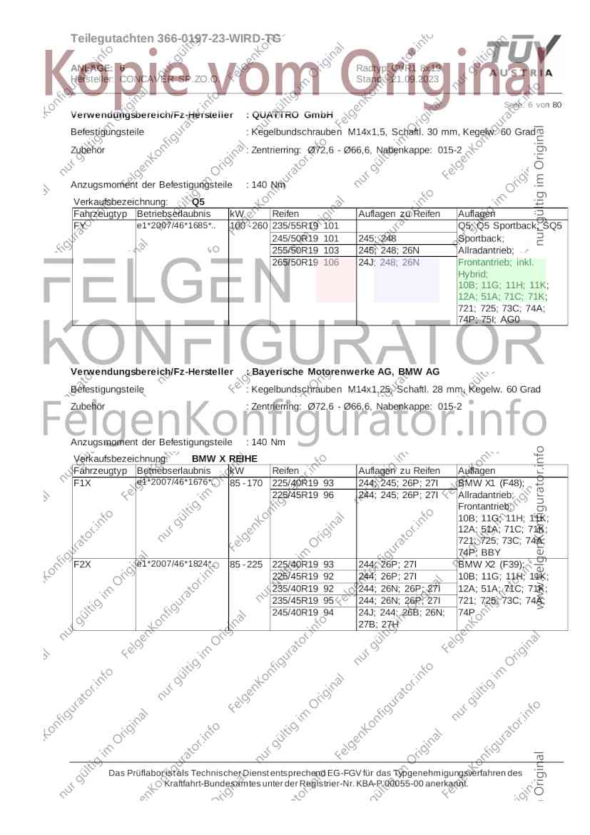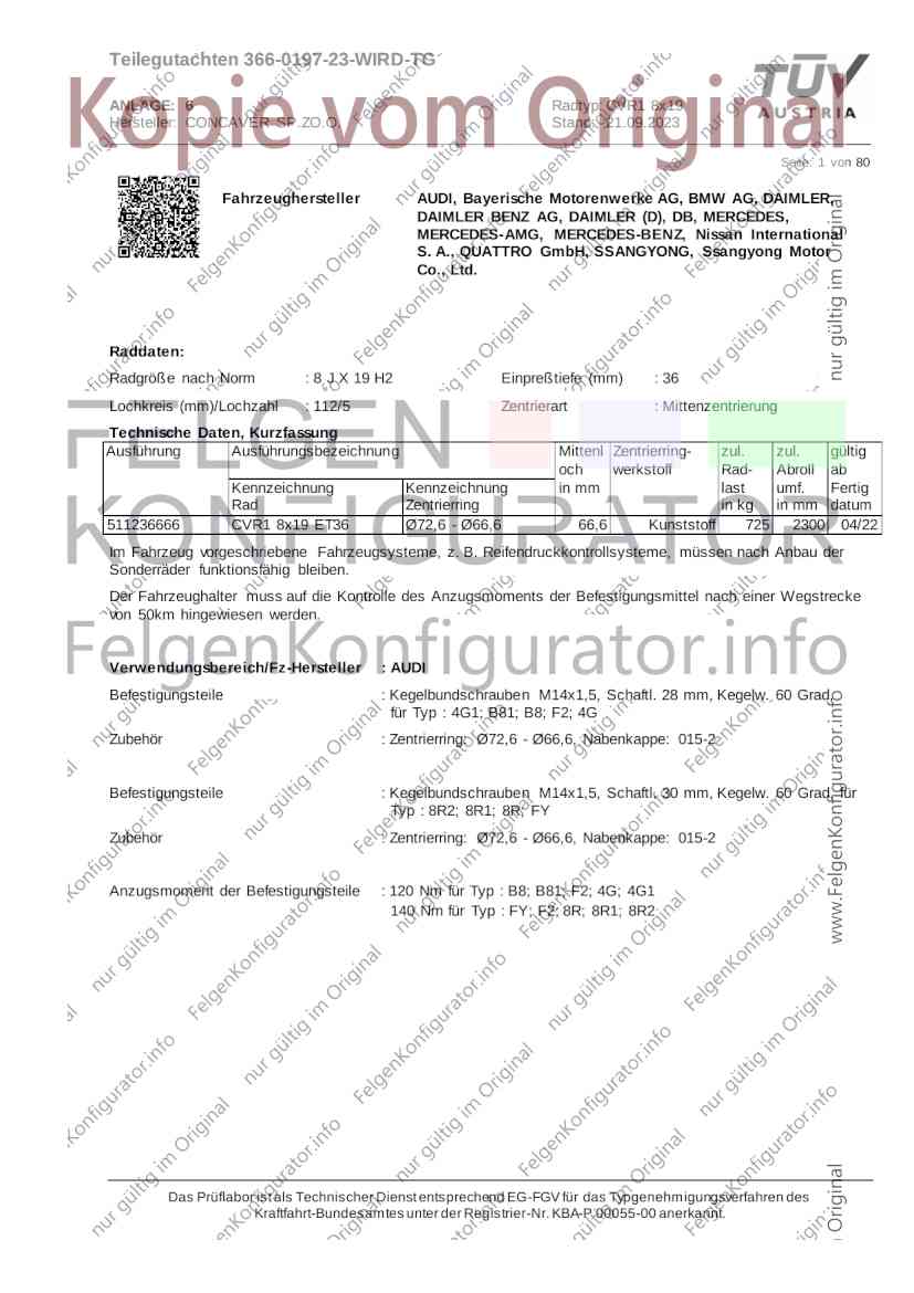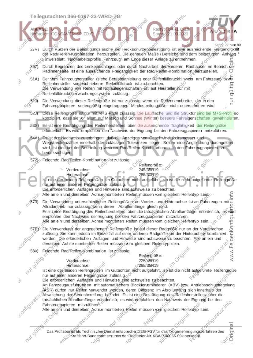 Teilegutachten 366-0197-23-WIRD-TG ANLAGE: 6 Radtyp: CVR1 8x19 Hersteller: CONCAVER SP.ZO.O. Stand: 21.09.2023 ______________________________________________________________________________________________________________ Seite: 1 von 80 Fahrzeughersteller AUDI, Bayerische Motorenwerke AG, BMW AG, DAIMLER, DAIMLER BENZ AG, DAIMLER (D), DB, MERCEDES, MERCEDES-AMG, MERCEDES-BENZ, Nissan International S. A., QUATTRO GmbH, SSANGYONG, Ssangyong Motor Co., Ltd. Raddaten: Radgröße nach Norm : 8 J X 19 H2 Einpreßtiefe (mm) : 36 Lochkreis (mm)/Lochzahl : 112/5 Zentrierart : Mittenzentrierung Technische Daten, Kurzfassung Ausführung Ausführungsbezeichnung Mittenl Zentrierring- zul. zul. gültig och werkstoff Rad- Abroll ab Kennzeichnung Kennzeichnung in mm last umf. Fertig Rad Zentrierring in kg in mm datum 511236666 CVR1 8x19 ET36 Ø72,6 - Ø66,6 66,6 Kunststoff 725 2300 04/22 Im Fahrzeug vorgeschriebene Fahrzeugsysteme, z. B. Reifendruckkontrollsysteme, müssen nach Anbau der Sonderräder funktionsfähig bleiben. Der Fahrzeughalter muss auf die Kontrolle des Anzugsmoments der Befestigungsmittel nach einer Wegstrecke von 50km hingewiesen werden. Verwendungsbereich/Fz-Hersteller : AUDI Befestigungsteile : Kegelbundschrauben M14x1,5, Schaftl. 28 mm, Kegelw. 60 Grad, für Typ : 4G1; B81; B8; F2; 4G Zubehör : Zentrierring: Ø72,6 - Ø66,6, Nabenkappe: 015-2 Befestigungsteile : Kegelbundschrauben M14x1,5, Schaftl. 30 mm, Kegelw. 60 Grad, für Typ : 8R2; 8R1; 8R; FY Zubehör : Zentrierring: Ø72,6 - Ø66,6, Nabenkappe: 015-2 Anzugsmoment der Befestigungsteile : 120 Nm für Typ : B8; B81; F2; 4G; 4G1 140 Nm für Typ : FY; F2; 8R; 8R1; 8R2 Das Prüflabor ist als Technischer Dienst entsprechend EG-FGV für das Typgenehmigungsverfahren des Kraftfahrt-Bundesamtes unter der Registrier-Nr. KBA-P 00055-00 anerkannt. Teilegutachten 366-0197-23-WIRD-TG ANLAGE: 6 Radtyp: CVR1 8x19 Hersteller: CONCAVER SP.ZO.O. Stand: 21.09.2023 ______________________________________________________________________________________________________________ Seite: 2 von 80 Verkaufsbezeichnung: AUDI A5,S5,A4,S4 Fahrzeugtyp Betriebserlaubnis kW Reifen Auflagen zu Reifen Auflagen B81 e13*2007/46*1084*.. 90 - 200 225/40R19 93W Nicht A4 Allroad 235/35R19 91Y Quattro; AUDI A4 (B9) 90 - 260 245/35R19 93Y 26P; 27I ab MJ2016; AUDI S4 260 225/40R19 M+S 52J (B9) ab MJ2016; Kombi; 235/35R19 M+S 52J Limousine; Allradantrieb; Frontantrieb; 10B; 11G; 11H; 11K; 12A; 51A; 71C; 71K; 721; 725; 73C; 74A; 74P; 77E; AG0 B81 e13*2007/46*1084*.. 88 - 195 235/35R19 91 22I; 51J AUDI A4 bis MJ2015; 245/35R19 93 YDE; 21P; 22I; 24J; Kombi; Frontantrieb; 24M; 51J 10B; 11G; 11H; 11K; 12A; 51A; 71C; 71K; 721; 725; 729; 73C; 74A; 74P; 76T; 77E; AG0 B81 e13*2007/46*1084*.. 100 - 200 235/35R19 91 22I; 5GG; 51J AUDI A4 bis MJ2015; 100 - 245 245/35R19 93 YDE; 21P; 22I; 24J; Nicht A4 Allroad 24M; 51J Quattro; AUDI S4 bis MJ2016; Kombi; Allradantrieb; 10B; 11G; 11H; 11K; 12A; 51A; 573; 71C; 71K; 721; 725; 729; 73C; 74A; 74P; 76T; 77E; AG0 Verkaufsbezeichnung: AUDI A5,S5,A4,S4, A4/A5 Avant/Sportback g-tron Fahrzeugtyp Betriebserlaubnis kW Reifen Auflagen zu Reifen Auflagen B8 e1*2001/116*0430*.. 90 - 200 225/40R19 93W Nicht A4 Allroad 235/35R19 91Y Quattro; AUDI A4 (B9) 90 - 260 245/35R19 93Y 26P; 27I ab MJ2016; AUDI S4 260 225/40R19 M+S 52J (B9) ab MJ2016; Kombi; 235/35R19 M+S 52J Limousine; Allradantrieb; Frontantrieb; 10B; 11G; 11H; 11K; 12A; 51A; 71C; 71K; 721; 725; 73C; 74A; 74P; 77E; AG0 B8 e1*2001/116*0430*.. 88 - 195 235/35R19 91 22I; 51J AUDI A4 bis MJ2015; 245/35R19 93 YDE; 21P; 22I; 24J; Limousine; 24M; 51J Frontantrieb; 10B; 11G; 11H; 11K; 12A; 51A; 71C; 71K; 721; 725; 729; 73C; 74A; 74P; 76T; 77E; AG0 Das Prüflabor ist als Technischer Dienst entsprechend EG-FGV für das Typgenehmigungsverfahren des Kraftfahrt-Bundesamtes unter der Registrier-Nr. KBA-P 00055-00 anerkannt. Teilegutachten 366-0197-23-WIRD-TG ANLAGE: 6 Radtyp: CVR1 8x19 Hersteller: CONCAVER SP.ZO.O. Stand: 21.09.2023 ______________________________________________________________________________________________________________ Seite: 3 von 80 Verkaufsbezeichnung: AUDI A5,S5,A4,S4, A4/A5 Avant/Sportback g-tron Fahrzeugtyp Betriebserlaubnis kW Reifen Auflagen zu Reifen Auflagen B8 e1*2001/116*0430*.. 88 - 195 235/35R19 91 22I; 51J AUDI A4 bis MJ2015; 245/35R19 93 YDE; 21P; 22I; 24J; Kombi; Frontantrieb; 24M; 51J 10B; 11G; 11H; 11K; 12A; 51A; 71C; 71K; 721; 725; 729; 73C; 74A; 74P; 76T; 77E; AG0 B8 e1*2001/116*0430*.. 100 - 200 235/35R19 91 22I; 51J AUDI A4 bis MJ2015; 100 - 245 245/35R19 93 YDE; 21P; 22I; 24J; AUDI S4 bis MJ2016; 24M; 51J Limousine; Allradantrieb; 10B; 11G; 11H; 11K; 12A; 51A; 573; 71C; 71K; 721; 725; 729; 73C; 74A; 74P; 76T; 77E; AG0 B8 e1*2001/116*0430*.. 100 - 200 235/35R19 91 22I; 5GG; 51J AUDI A4 bis MJ2015; 100 - 245 245/35R19 93 YDE; 21P; 22I; 24J; Nicht A4 Allroad 24M; 51J Quattro; AUDI S4 bis MJ2016; Kombi; Allradantrieb; 10B; 11G; 11H; 11K; 12A; 51A; 573; 71C; 71K; 721; 725; 729; 73C; 74A; 74P; 76T; 77E; AG0 Verkaufsbezeichnung: AUDI Q5 Fahrzeugtyp Betriebserlaubnis kW Reifen Auflagen zu Reifen Auflagen 8R e13*2007/46*1083*.. 100 - 260 235/55R19 101 10B; 11G; 11H; 11K; 245/50R19 101 12A; 51A; 573; 71C; 71K; 721; 725; 73C; 74A; 74P; PDI Verkaufsbezeichnung: AUDI Q5 HYBRID Fahrzeugtyp Betriebserlaubnis kW Reifen Auflagen zu Reifen Auflagen 8R2 e13*2007/46*1179*.. 100 - 260 235/55R19 101 10B; 11G; 11H; 11K; 245/50R19 101 12A; 51A; 573; 71C; 71K; 721; 725; 73C; 74A; 74P; PDI Verkaufsbezeichnung: AUDI Q5,SQ5,SQ5 TDI Fahrzeugtyp Betriebserlaubnis kW Reifen Auflagen zu Reifen Auflagen 8R e1*2001/116*0473*.. 100 - 260 235/55R19 101 10B; 11G; 11H; 11K; 245/50R19 101 12A; 51A; 573; 71C; 71K; 721; 725; 73C; 74A; 74P; PDI Das Prüflabor ist als Technischer Dienst entsprechend EG-FGV für das Typgenehmigungsverfahren des Kraftfahrt-Bundesamtes unter der Registrier-Nr. KBA-P 00055-00 anerkannt. Teilegutachten 366-0197-23-WIRD-TG ANLAGE: 6 Radtyp: CVR1 8x19 Hersteller: CONCAVER SP.