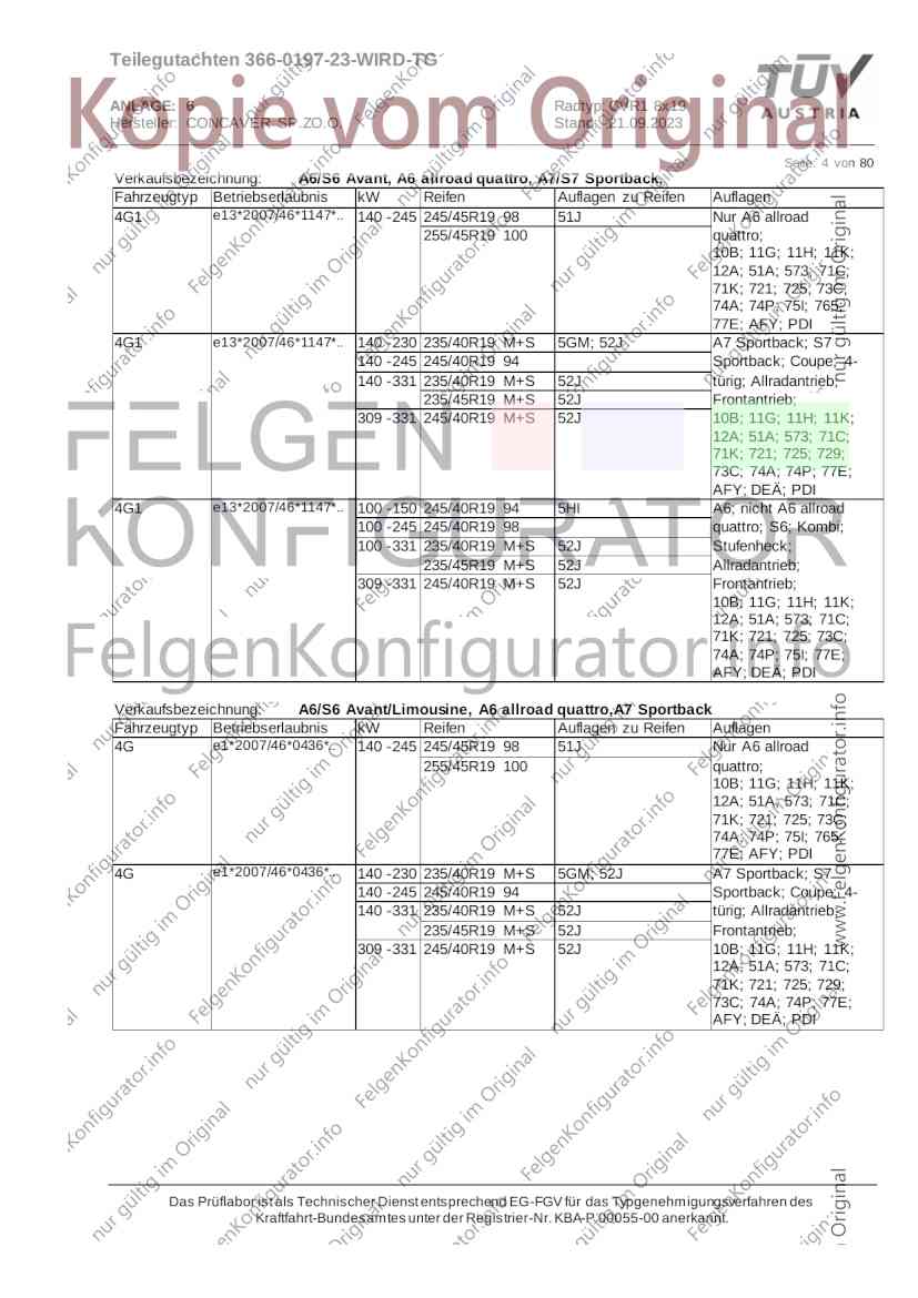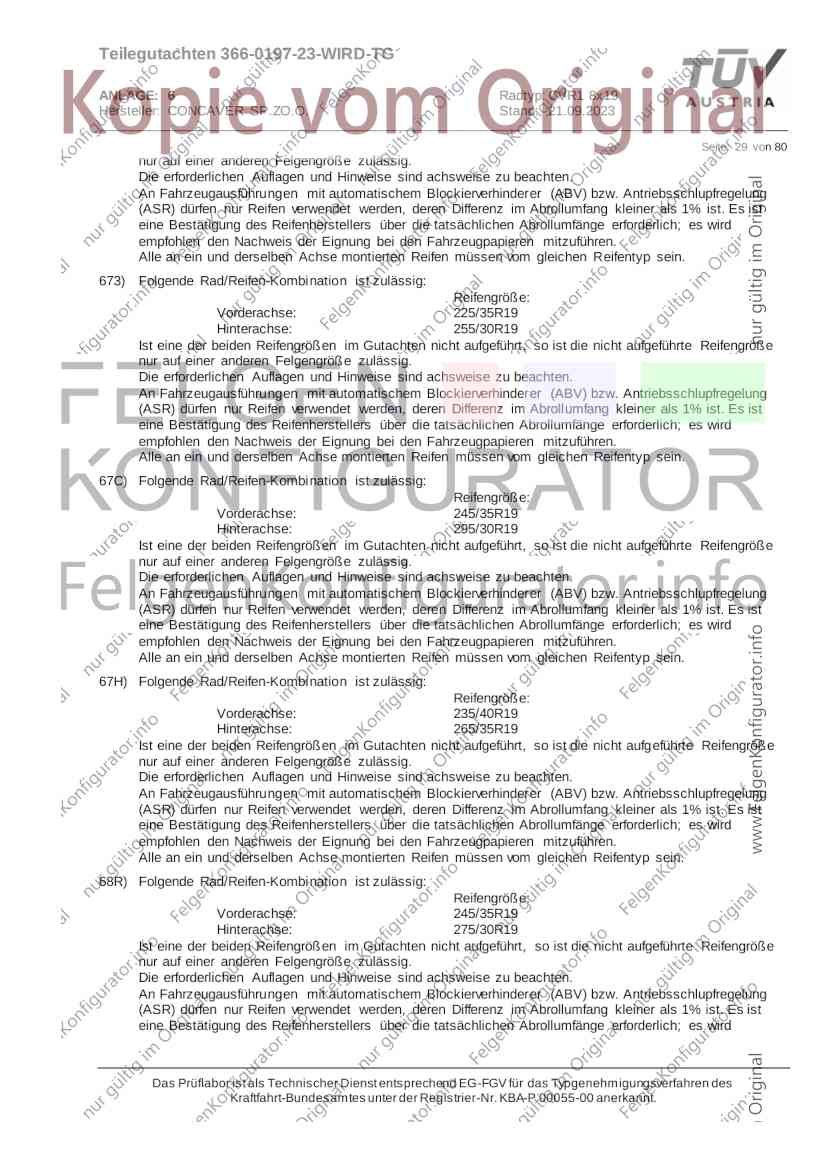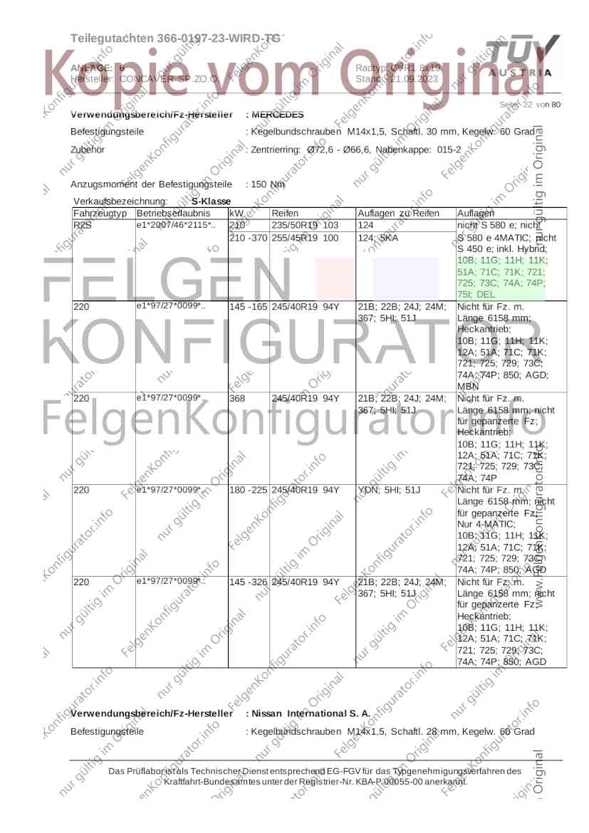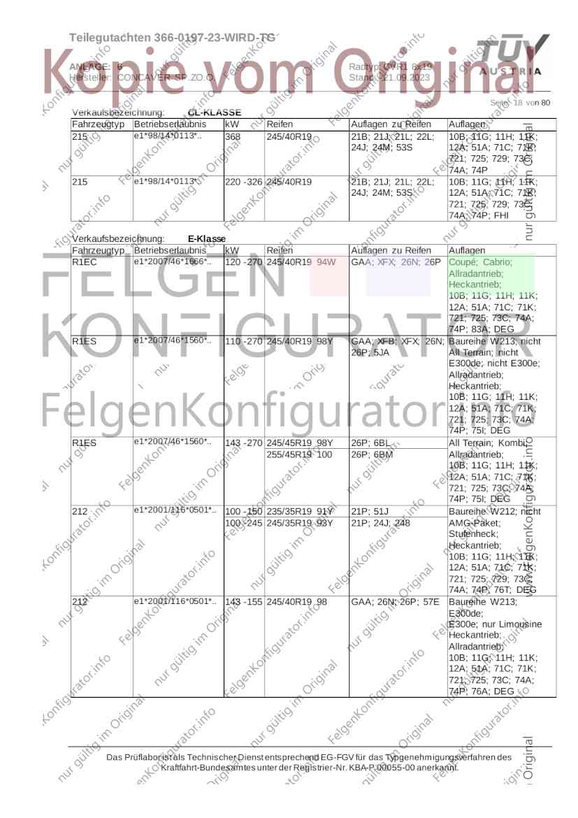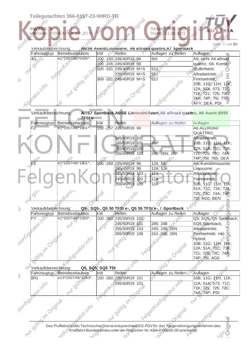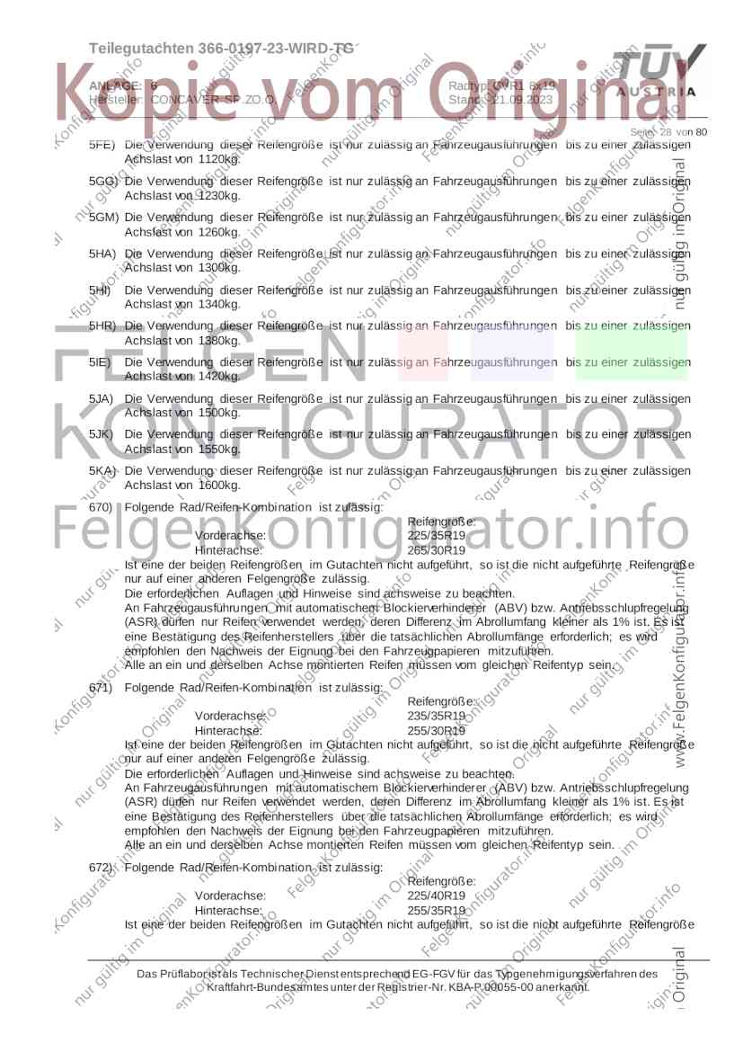 Teilegutachten 366-0197-23-WIRD-TG ANLAGE: 6 Radtyp: CVR1 8x19 Hersteller: CONCAVER SP.ZO.O. Stand: 21.09.2023 ______________________________________________________________________________________________________________ Seite: 1 von 80 Fahrzeughersteller AUDI, Bayerische Motorenwerke AG, BMW AG, DAIMLER, DAIMLER BENZ AG, DAIMLER (D), DB, MERCEDES, MERCEDES-AMG, MERCEDES-BENZ, Nissan International S. A., QUATTRO GmbH, SSANGYONG, Ssangyong Motor Co., Ltd. Raddaten: Radgröße nach Norm : 8 J X 19 H2 Einpreßtiefe (mm) : 36 Lochkreis (mm)/Lochzahl : 112/5 Zentrierart : Mittenzentrierung Technische Daten, Kurzfassung Ausführung Ausführungsbezeichnung Mittenl Zentrierring- zul. zul. gültig och werkstoff Rad- Abroll ab Kennzeichnung Kennzeichnung in mm last umf. Fertig Rad Zentrierring in kg in mm datum 511236666 CVR1 8x19 ET36 Ø72,6 - Ø66,6 66,6 Kunststoff 725 2300 04/22 Im Fahrzeug vorgeschriebene Fahrzeugsysteme, z. B. Reifendruckkontrollsysteme, müssen nach Anbau der Sonderräder funktionsfähig bleiben. Der Fahrzeughalter muss auf die Kontrolle des Anzugsmoments der Befestigungsmittel nach einer Wegstrecke von 50km hingewiesen werden. Verwendungsbereich/Fz-Hersteller : AUDI Befestigungsteile : Kegelbundschrauben M14x1,5, Schaftl. 28 mm, Kegelw. 60 Grad, für Typ : 4G1; B81; B8; F2; 4G Zubehör : Zentrierring: Ø72,6 - Ø66,6, Nabenkappe: 015-2 Befestigungsteile : Kegelbundschrauben M14x1,5, Schaftl. 30 mm, Kegelw. 60 Grad, für Typ : 8R2; 8R1; 8R; FY Zubehör : Zentrierring: Ø72,6 - Ø66,6, Nabenkappe: 015-2 Anzugsmoment der Befestigungsteile : 120 Nm für Typ : B8; B81; F2; 4G; 4G1 140 Nm für Typ : FY; F2; 8R; 8R1; 8R2 Das Prüflabor ist als Technischer Dienst entsprechend EG-FGV für das Typgenehmigungsverfahren des Kraftfahrt-Bundesamtes unter der Registrier-Nr. KBA-P 00055-00 anerkannt. Teilegutachten 366-0197-23-WIRD-TG ANLAGE: 6 Radtyp: CVR1 8x19 Hersteller: CONCAVER SP.ZO.O. Stand: 21.09.2023 ______________________________________________________________________________________________________________ Seite: 2 von 80 Verkaufsbezeichnung: AUDI A5,S5,A4,S4 Fahrzeugtyp Betriebserlaubnis kW Reifen Auflagen zu Reifen Auflagen B81 e13*2007/46*1084*.. 90 - 200 225/40R19 93W Nicht A4 Allroad 235/35R19 91Y Quattro; AUDI A4 (B9) 90 - 260 245/35R19 93Y 26P; 27I ab MJ2016; AUDI S4 260 225/40R19 M+S 52J (B9) ab MJ2016; Kombi; 235/35R19 M+S 52J Limousine; Allradantrieb; Frontantrieb; 10B; 11G; 11H; 11K; 12A; 51A; 71C; 71K; 721; 725; 73C; 74A; 74P; 77E; AG0 B81 e13*2007/46*1084*.. 88 - 195 235/35R19 91 22I; 51J AUDI A4 bis MJ2015; 245/35R19 93 YDE; 21P; 22I; 24J; Kombi; Frontantrieb; 24M; 51J 10B; 11G; 11H; 11K; 12A; 51A; 71C; 71K; 721; 725; 729; 73C; 74A; 74P; 76T; 77E; AG0 B81 e13*2007/46*1084*.. 100 - 200 235/35R19 91 22I; 5GG; 51J AUDI A4 bis MJ2015; 100 - 245 245/35R19 93 YDE; 21P; 22I; 24J; Nicht A4 Allroad 24M; 51J Quattro; AUDI S4 bis MJ2016; Kombi; Allradantrieb; 10B; 11G; 11H; 11K; 12A; 51A; 573; 71C; 71K; 721; 725; 729; 73C; 74A; 74P; 76T; 77E; AG0 Verkaufsbezeichnung: AUDI A5,S5,A4,S4, A4/A5 Avant/Sportback g-tron Fahrzeugtyp Betriebserlaubnis kW Reifen Auflagen zu Reifen Auflagen B8 e1*2001/116*0430*.. 90 - 200 225/40R19 93W Nicht A4 Allroad 235/35R19 91Y Quattro; AUDI A4 (B9) 90 - 260 245/35R19 93Y 26P; 27I ab MJ2016; AUDI S4 260 225/40R19 M+S 52J (B9) ab MJ2016; Kombi; 235/35R19 M+S 52J Limousine; Allradantrieb; Frontantrieb; 10B; 11G; 11H; 11K; 12A; 51A; 71C; 71K; 721; 725; 73C; 74A; 74P; 77E; AG0 B8 e1*2001/116*0430*.. 88 - 195 235/35R19 91 22I; 51J AUDI A4 bis MJ2015; 245/35R19 93 YDE; 21P; 22I; 24J; Limousine; 24M; 51J Frontantrieb; 10B; 11G; 11H; 11K; 12A; 51A; 71C; 71K; 721; 725; 729; 73C; 74A; 74P; 76T; 77E; AG0 Das Prüflabor ist als Technischer Dienst entsprechend EG-FGV für das Typgenehmigungsverfahren des Kraftfahrt-Bundesamtes unter der Registrier-Nr. KBA-P 00055-00 anerkannt. Teilegutachten 366-0197-23-WIRD-TG ANLAGE: 6 Radtyp: CVR1 8x19 Hersteller: CONCAVER SP.ZO.O. Stand: 21.09.2023 ______________________________________________________________________________________________________________ Seite: 3 von 80 Verkaufsbezeichnung: AUDI A5,S5,A4,S4, A4/A5 Avant/Sportback g-tron Fahrzeugtyp Betriebserlaubnis kW Reifen Auflagen zu Reifen Auflagen B8 e1*2001/116*0430*.. 88 - 195 235/35R19 91 22I; 51J AUDI A4 bis MJ2015; 245/35R19 93 YDE; 21P; 22I; 24J; Kombi; Frontantrieb; 24M; 51J 10B; 11G; 11H; 11K; 12A; 51A; 71C; 71K; 721; 725; 729; 73C; 74A; 74P; 76T; 77E; AG0 B8 e1*2001/116*0430*.. 100 - 200 235/35R19 91 22I; 51J AUDI A4 bis MJ2015; 100 - 245 245/35R19 93 YDE; 21P; 22I; 24J; AUDI S4 bis MJ2016; 24M; 51J Limousine; Allradantrieb; 10B; 11G; 11H; 11K; 12A; 51A; 573; 71C; 71K; 721; 725; 729; 73C; 74A; 74P; 76T; 77E; AG0 B8 e1*2001/116*0430*.. 100 - 200 235/35R19 91 22I; 5GG; 51J AUDI A4 bis MJ2015; 100 - 245 245/35R19 93 YDE; 21P; 22I; 24J; Nicht A4 Allroad 24M; 51J Quattro; AUDI S4 bis MJ2016; Kombi; Allradantrieb; 10B; 11G; 11H; 11K; 12A; 51A; 573; 71C; 71K; 721; 725; 729; 73C; 74A; 74P; 76T; 77E; AG0 Verkaufsbezeichnung: AUDI Q5 Fahrzeugtyp Betriebserlaubnis kW Reifen Auflagen zu Reifen Auflagen 8R e13*2007/46*1083*.. 100 - 260 235/55R19 101 10B; 11G; 11H; 11K; 245/50R19 101 12A; 51A; 573; 71C; 71K; 721; 725; 73C; 74A; 74P; PDI Verkaufsbezeichnung: AUDI Q5 HYBRID Fahrzeugtyp Betriebserlaubnis kW Reifen Auflagen zu Reifen Auflagen 8R2 e13*2007/46*1179*.. 100 - 260 235/55R19 101 10B; 11G; 11H; 11K; 245/50R19 101 12A; 51A; 573; 71C; 71K; 721; 725; 73C; 74A; 74P; PDI Verkaufsbezeichnung: AUDI Q5,SQ5,SQ5 TDI Fahrzeugtyp Betriebserlaubnis kW Reifen Auflagen zu Reifen Auflagen 8R e1*2001/116*0473*.. 100 - 260 235/55R19 101 10B; 11G; 11H; 11K; 245/50R19 101 12A; 51A; 573; 71C; 71K; 721; 725; 73C; 74A; 74P; PDI Das Prüflabor ist als Technischer Dienst entsprechend EG-FGV für das Typgenehmigungsverfahren des Kraftfahrt-Bundesamtes unter der Registrier-Nr. KBA-P 00055-00 anerkannt. Teilegutachten 366-0197-23-WIRD-TG ANLAGE: 6 Radtyp: CVR1 8x19 Hersteller: CONCAVER SP.