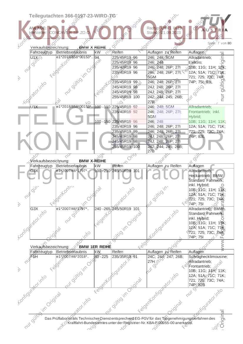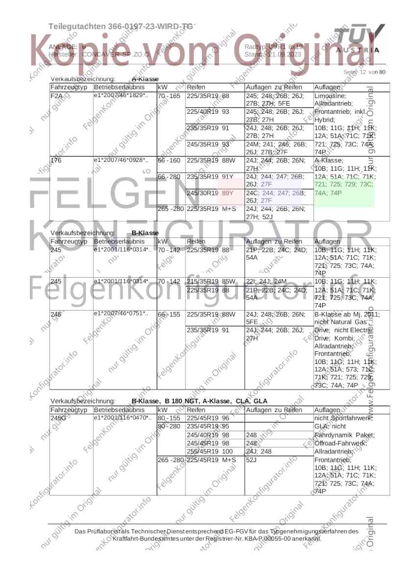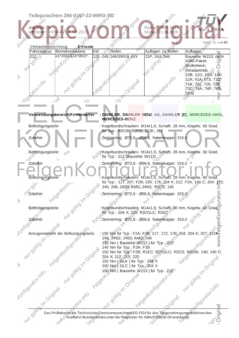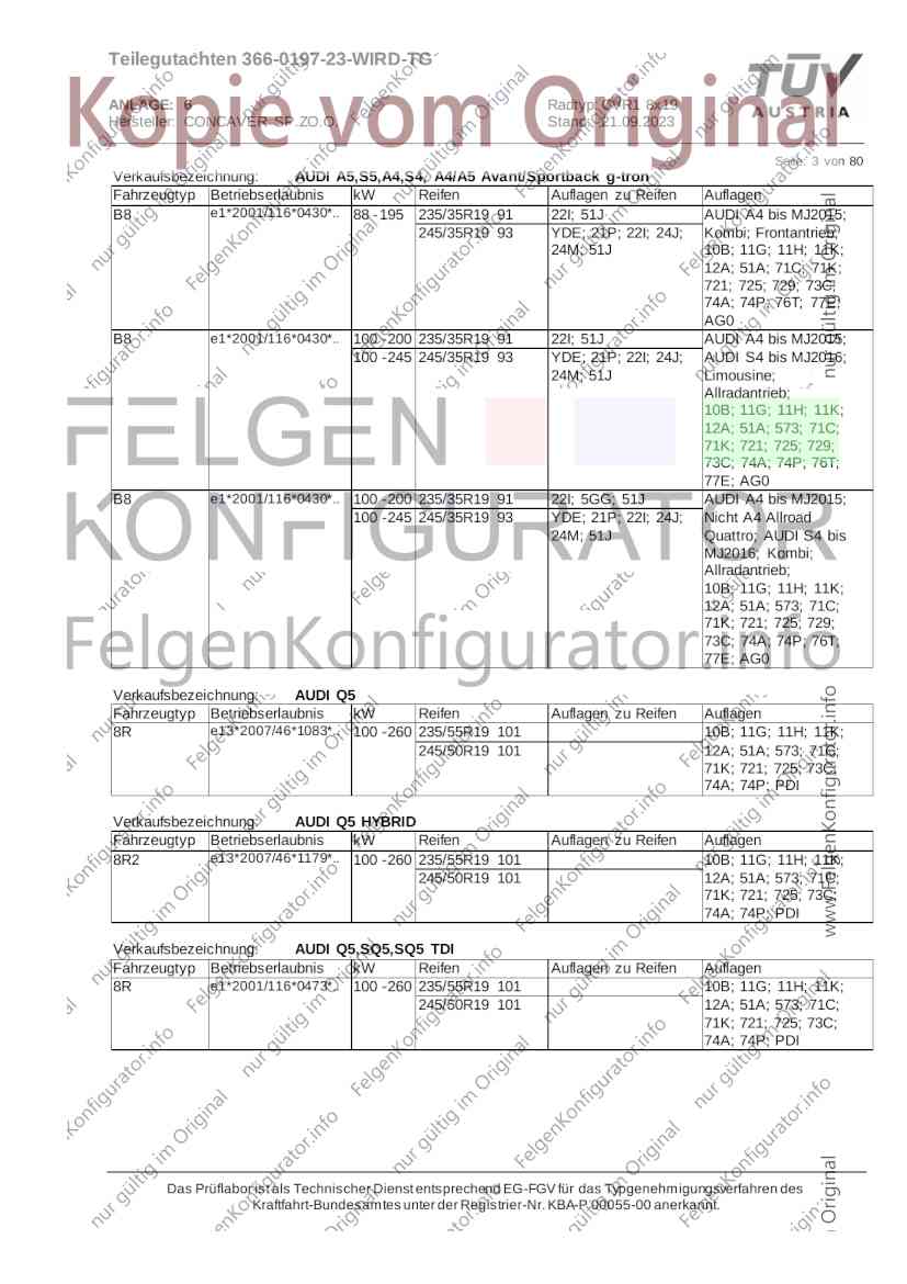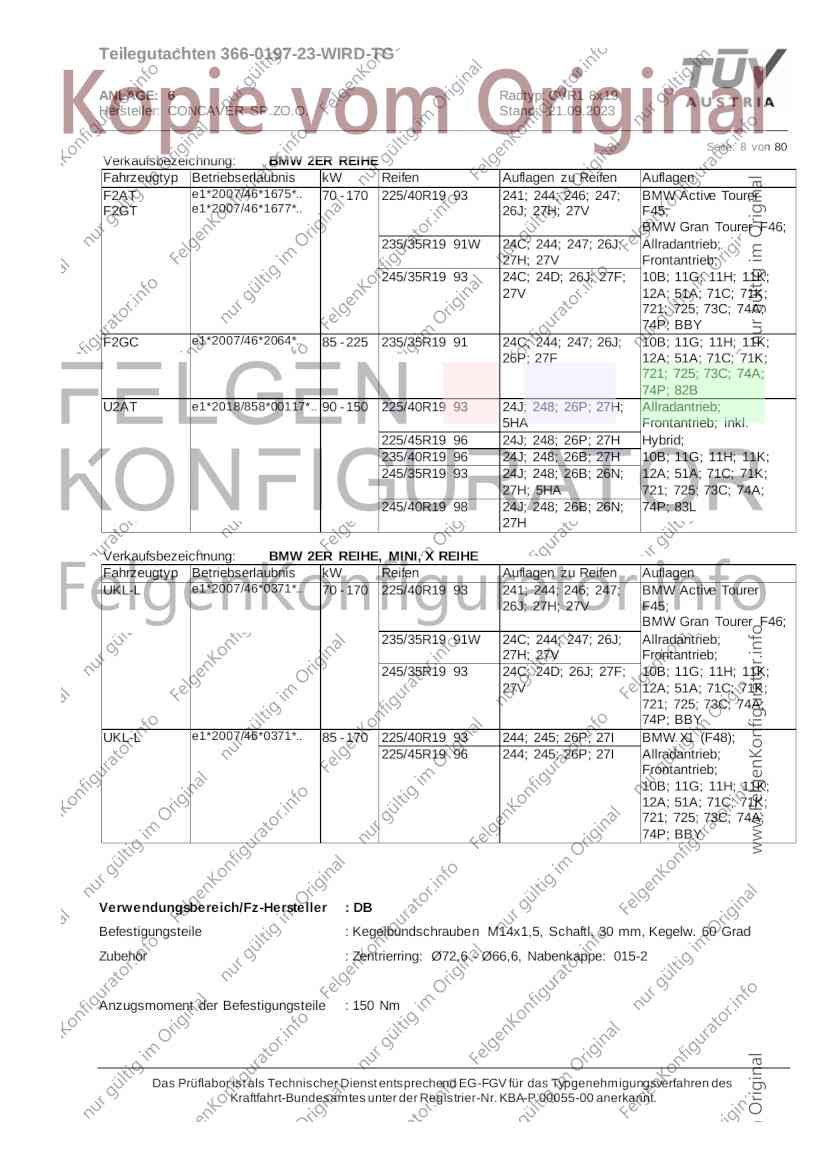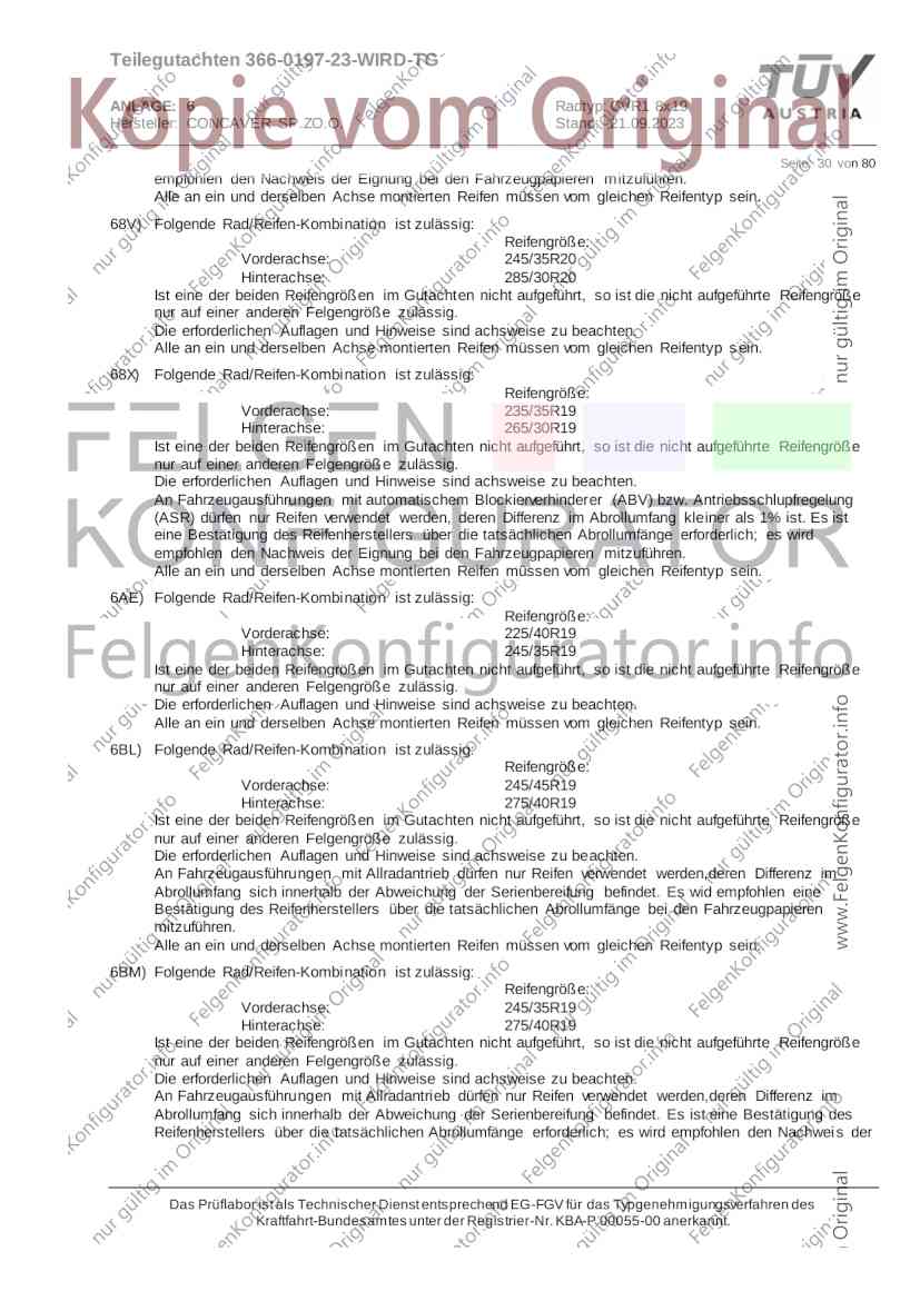 Teilegutachten 366-0197-23-WIRD-TG ANLAGE: 6 Radtyp: CVR1 8x19 Hersteller: CONCAVER SP.ZO.O. Stand: 21.09.2023 ______________________________________________________________________________________________________________ Seite: 1 von 80 Fahrzeughersteller AUDI, Bayerische Motorenwerke AG, BMW AG, DAIMLER, DAIMLER BENZ AG, DAIMLER (D), DB, MERCEDES, MERCEDES-AMG, MERCEDES-BENZ, Nissan International S. A., QUATTRO GmbH, SSANGYONG, Ssangyong Motor Co., Ltd. Raddaten: Radgröße nach Norm : 8 J X 19 H2 Einpreßtiefe (mm) : 36 Lochkreis (mm)/Lochzahl : 112/5 Zentrierart : Mittenzentrierung Technische Daten, Kurzfassung Ausführung Ausführungsbezeichnung Mittenl Zentrierring- zul. zul. gültig och werkstoff Rad- Abroll ab Kennzeichnung Kennzeichnung in mm last umf. Fertig Rad Zentrierring in kg in mm datum 511236666 CVR1 8x19 ET36 Ø72,6 - Ø66,6 66,6 Kunststoff 725 2300 04/22 Im Fahrzeug vorgeschriebene Fahrzeugsysteme, z. B. Reifendruckkontrollsysteme, müssen nach Anbau der Sonderräder funktionsfähig bleiben. Der Fahrzeughalter muss auf die Kontrolle des Anzugsmoments der Befestigungsmittel nach einer Wegstrecke von 50km hingewiesen werden. Verwendungsbereich/Fz-Hersteller : AUDI Befestigungsteile : Kegelbundschrauben M14x1,5, Schaftl. 28 mm, Kegelw. 60 Grad, für Typ : 4G1; B81; B8; F2; 4G Zubehör : Zentrierring: Ø72,6 - Ø66,6, Nabenkappe: 015-2 Befestigungsteile : Kegelbundschrauben M14x1,5, Schaftl. 30 mm, Kegelw. 60 Grad, für Typ : 8R2; 8R1; 8R; FY Zubehör : Zentrierring: Ø72,6 - Ø66,6, Nabenkappe: 015-2 Anzugsmoment der Befestigungsteile : 120 Nm für Typ : B8; B81; F2; 4G; 4G1 140 Nm für Typ : FY; F2; 8R; 8R1; 8R2 Das Prüflabor ist als Technischer Dienst entsprechend EG-FGV für das Typgenehmigungsverfahren des Kraftfahrt-Bundesamtes unter der Registrier-Nr. KBA-P 00055-00 anerkannt. Teilegutachten 366-0197-23-WIRD-TG ANLAGE: 6 Radtyp: CVR1 8x19 Hersteller: CONCAVER SP.ZO.O. Stand: 21.09.2023 ______________________________________________________________________________________________________________ Seite: 2 von 80 Verkaufsbezeichnung: AUDI A5,S5,A4,S4 Fahrzeugtyp Betriebserlaubnis kW Reifen Auflagen zu Reifen Auflagen B81 e13*2007/46*1084*.. 90 - 200 225/40R19 93W Nicht A4 Allroad 235/35R19 91Y Quattro; AUDI A4 (B9) 90 - 260 245/35R19 93Y 26P; 27I ab MJ2016; AUDI S4 260 225/40R19 M+S 52J (B9) ab MJ2016; Kombi; 235/35R19 M+S 52J Limousine; Allradantrieb; Frontantrieb; 10B; 11G; 11H; 11K; 12A; 51A; 71C; 71K; 721; 725; 73C; 74A; 74P; 77E; AG0 B81 e13*2007/46*1084*.. 88 - 195 235/35R19 91 22I; 51J AUDI A4 bis MJ2015; 245/35R19 93 YDE; 21P; 22I; 24J; Kombi; Frontantrieb; 24M; 51J 10B; 11G; 11H; 11K; 12A; 51A; 71C; 71K; 721; 725; 729; 73C; 74A; 74P; 76T; 77E; AG0 B81 e13*2007/46*1084*.. 100 - 200 235/35R19 91 22I; 5GG; 51J AUDI A4 bis MJ2015; 100 - 245 245/35R19 93 YDE; 21P; 22I; 24J; Nicht A4 Allroad 24M; 51J Quattro; AUDI S4 bis MJ2016; Kombi; Allradantrieb; 10B; 11G; 11H; 11K; 12A; 51A; 573; 71C; 71K; 721; 725; 729; 73C; 74A; 74P; 76T; 77E; AG0 Verkaufsbezeichnung: AUDI A5,S5,A4,S4, A4/A5 Avant/Sportback g-tron Fahrzeugtyp Betriebserlaubnis kW Reifen Auflagen zu Reifen Auflagen B8 e1*2001/116*0430*.. 90 - 200 225/40R19 93W Nicht A4 Allroad 235/35R19 91Y Quattro; AUDI A4 (B9) 90 - 260 245/35R19 93Y 26P; 27I ab MJ2016; AUDI S4 260 225/40R19 M+S 52J (B9) ab MJ2016; Kombi; 235/35R19 M+S 52J Limousine; Allradantrieb; Frontantrieb; 10B; 11G; 11H; 11K; 12A; 51A; 71C; 71K; 721; 725; 73C; 74A; 74P; 77E; AG0 B8 e1*2001/116*0430*.. 88 - 195 235/35R19 91 22I; 51J AUDI A4 bis MJ2015; 245/35R19 93 YDE; 21P; 22I; 24J; Limousine; 24M; 51J Frontantrieb; 10B; 11G; 11H; 11K; 12A; 51A; 71C; 71K; 721; 725; 729; 73C; 74A; 74P; 76T; 77E; AG0 Das Prüflabor ist als Technischer Dienst entsprechend EG-FGV für das Typgenehmigungsverfahren des Kraftfahrt-Bundesamtes unter der Registrier-Nr. KBA-P 00055-00 anerkannt. Teilegutachten 366-0197-23-WIRD-TG ANLAGE: 6 Radtyp: CVR1 8x19 Hersteller: CONCAVER SP.ZO.O. Stand: 21.09.2023 ______________________________________________________________________________________________________________ Seite: 3 von 80 Verkaufsbezeichnung: AUDI A5,S5,A4,S4, A4/A5 Avant/Sportback g-tron Fahrzeugtyp Betriebserlaubnis kW Reifen Auflagen zu Reifen Auflagen B8 e1*2001/116*0430*.. 88 - 195 235/35R19 91 22I; 51J AUDI A4 bis MJ2015; 245/35R19 93 YDE; 21P; 22I; 24J; Kombi; Frontantrieb; 24M; 51J 10B; 11G; 11H; 11K; 12A; 51A; 71C; 71K; 721; 725; 729; 73C; 74A; 74P; 76T; 77E; AG0 B8 e1*2001/116*0430*.. 100 - 200 235/35R19 91 22I; 51J AUDI A4 bis MJ2015; 100 - 245 245/35R19 93 YDE; 21P; 22I; 24J; AUDI S4 bis MJ2016; 24M; 51J Limousine; Allradantrieb; 10B; 11G; 11H; 11K; 12A; 51A; 573; 71C; 71K; 721; 725; 729; 73C; 74A; 74P; 76T; 77E; AG0 B8 e1*2001/116*0430*.. 100 - 200 235/35R19 91 22I; 5GG; 51J AUDI A4 bis MJ2015; 100 - 245 245/35R19 93 YDE; 21P; 22I; 24J; Nicht A4 Allroad 24M; 51J Quattro; AUDI S4 bis MJ2016; Kombi; Allradantrieb; 10B; 11G; 11H; 11K; 12A; 51A; 573; 71C; 71K; 721; 725; 729; 73C; 74A; 74P; 76T; 77E; AG0 Verkaufsbezeichnung: AUDI Q5 Fahrzeugtyp Betriebserlaubnis kW Reifen Auflagen zu Reifen Auflagen 8R e13*2007/46*1083*.. 100 - 260 235/55R19 101 10B; 11G; 11H; 11K; 245/50R19 101 12A; 51A; 573; 71C; 71K; 721; 725; 73C; 74A; 74P; PDI Verkaufsbezeichnung: AUDI Q5 HYBRID Fahrzeugtyp Betriebserlaubnis kW Reifen Auflagen zu Reifen Auflagen 8R2 e13*2007/46*1179*.. 100 - 260 235/55R19 101 10B; 11G; 11H; 11K; 245/50R19 101 12A; 51A; 573; 71C; 71K; 721; 725; 73C; 74A; 74P; PDI Verkaufsbezeichnung: AUDI Q5,SQ5,SQ5 TDI Fahrzeugtyp Betriebserlaubnis kW Reifen Auflagen zu Reifen Auflagen 8R e1*2001/116*0473*.. 100 - 260 235/55R19 101 10B; 11G; 11H; 11K; 245/50R19 101 12A; 51A; 573; 71C; 71K; 721; 725; 73C; 74A; 74P; PDI Das Prüflabor ist als Technischer Dienst entsprechend EG-FGV für das Typgenehmigungsverfahren des Kraftfahrt-Bundesamtes unter der Registrier-Nr. KBA-P 00055-00 anerkannt. Teilegutachten 366-0197-23-WIRD-TG ANLAGE: 6 Radtyp: CVR1 8x19 Hersteller: CONCAVER SP.