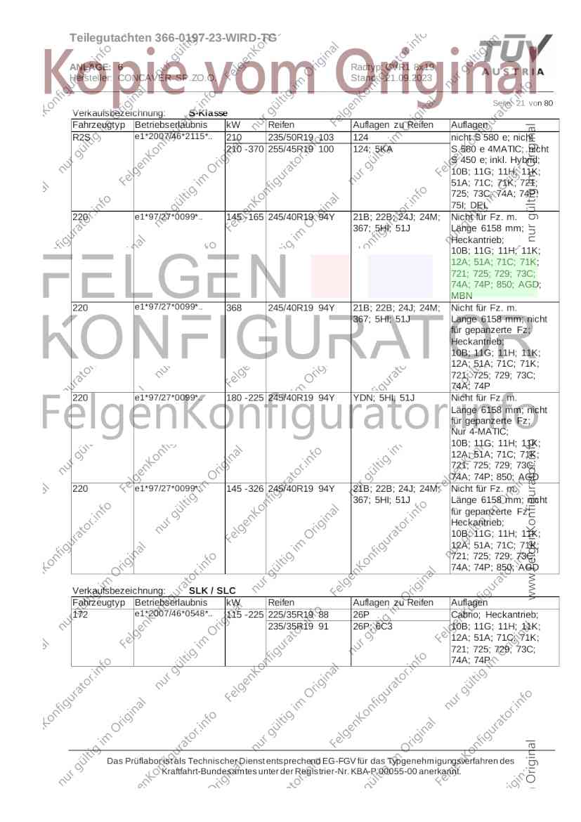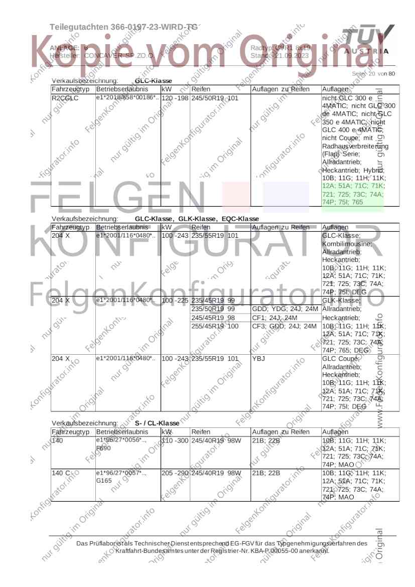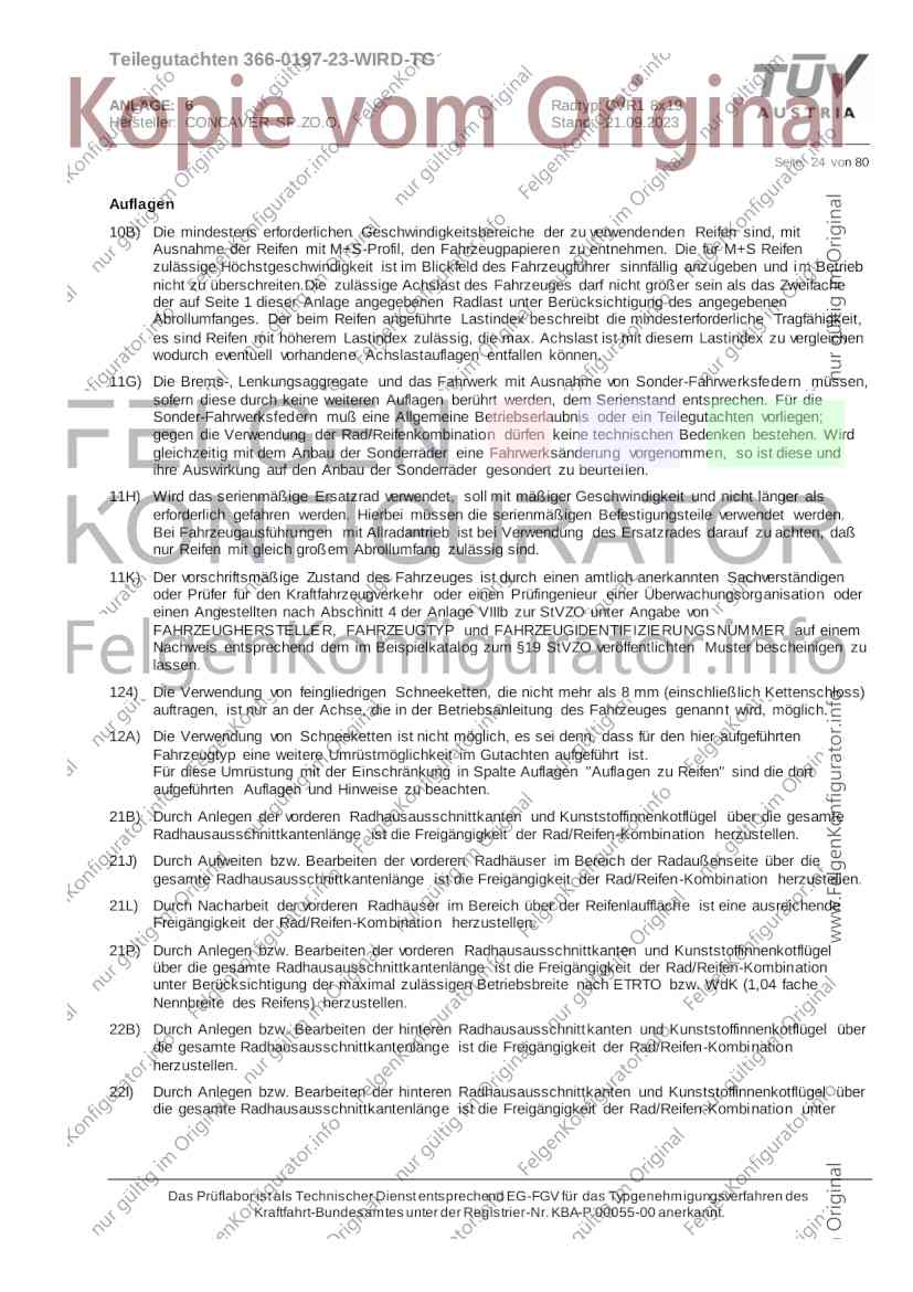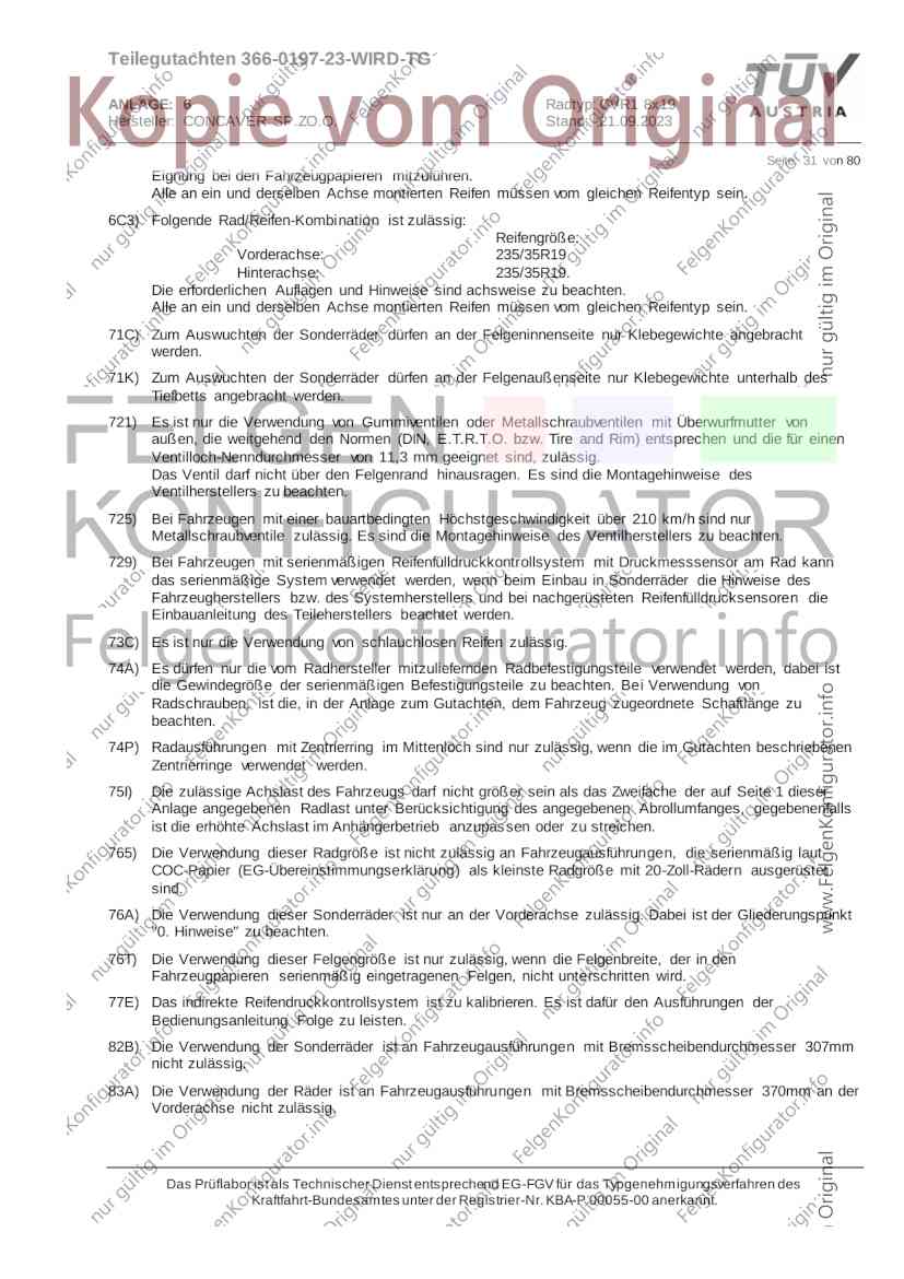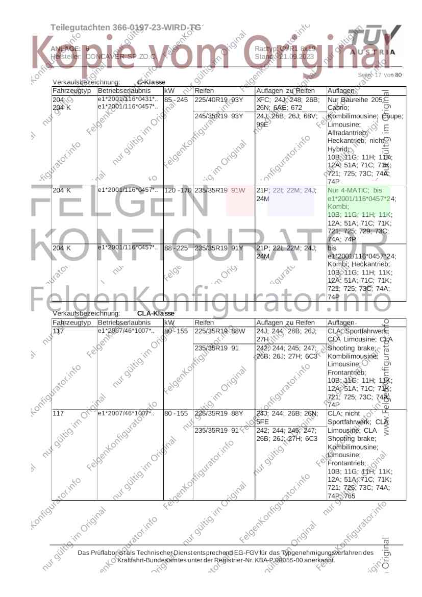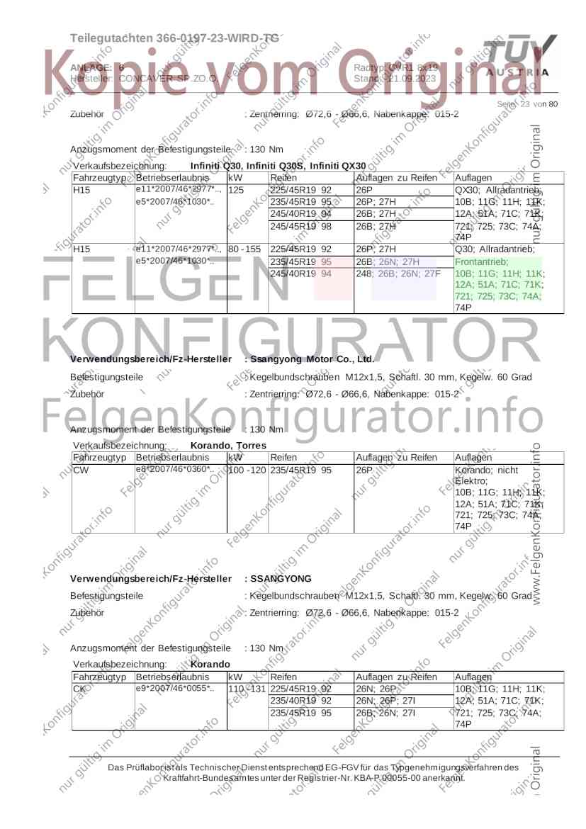 Teilegutachten 366-0197-23-WIRD-TG ANLAGE: 6 Radtyp: CVR1 8x19 Hersteller: CONCAVER SP.ZO.O. Stand: 21.09.2023 ______________________________________________________________________________________________________________ Seite: 1 von 80 Fahrzeughersteller AUDI, Bayerische Motorenwerke AG, BMW AG, DAIMLER, DAIMLER BENZ AG, DAIMLER (D), DB, MERCEDES, MERCEDES-AMG, MERCEDES-BENZ, Nissan International S. A., QUATTRO GmbH, SSANGYONG, Ssangyong Motor Co., Ltd. Raddaten: Radgröße nach Norm : 8 J X 19 H2 Einpreßtiefe (mm) : 36 Lochkreis (mm)/Lochzahl : 112/5 Zentrierart : Mittenzentrierung Technische Daten, Kurzfassung Ausführung Ausführungsbezeichnung Mittenl Zentrierring- zul. zul. gültig och werkstoff Rad- Abroll ab Kennzeichnung Kennzeichnung in mm last umf. Fertig Rad Zentrierring in kg in mm datum 511236666 CVR1 8x19 ET36 Ø72,6 - Ø66,6 66,6 Kunststoff 725 2300 04/22 Im Fahrzeug vorgeschriebene Fahrzeugsysteme, z. B. Reifendruckkontrollsysteme, müssen nach Anbau der Sonderräder funktionsfähig bleiben. Der Fahrzeughalter muss auf die Kontrolle des Anzugsmoments der Befestigungsmittel nach einer Wegstrecke von 50km hingewiesen werden. Verwendungsbereich/Fz-Hersteller : AUDI Befestigungsteile : Kegelbundschrauben M14x1,5, Schaftl. 28 mm, Kegelw. 60 Grad, für Typ : 4G1; B81; B8; F2; 4G Zubehör : Zentrierring: Ø72,6 - Ø66,6, Nabenkappe: 015-2 Befestigungsteile : Kegelbundschrauben M14x1,5, Schaftl. 30 mm, Kegelw. 60 Grad, für Typ : 8R2; 8R1; 8R; FY Zubehör : Zentrierring: Ø72,6 - Ø66,6, Nabenkappe: 015-2 Anzugsmoment der Befestigungsteile : 120 Nm für Typ : B8; B81; F2; 4G; 4G1 140 Nm für Typ : FY; F2; 8R; 8R1; 8R2 Das Prüflabor ist als Technischer Dienst entsprechend EG-FGV für das Typgenehmigungsverfahren des Kraftfahrt-Bundesamtes unter der Registrier-Nr. KBA-P 00055-00 anerkannt. Teilegutachten 366-0197-23-WIRD-TG ANLAGE: 6 Radtyp: CVR1 8x19 Hersteller: CONCAVER SP.ZO.O. Stand: 21.09.2023 ______________________________________________________________________________________________________________ Seite: 2 von 80 Verkaufsbezeichnung: AUDI A5,S5,A4,S4 Fahrzeugtyp Betriebserlaubnis kW Reifen Auflagen zu Reifen Auflagen B81 e13*2007/46*1084*.. 90 - 200 225/40R19 93W Nicht A4 Allroad 235/35R19 91Y Quattro; AUDI A4 (B9) 90 - 260 245/35R19 93Y 26P; 27I ab MJ2016; AUDI S4 260 225/40R19 M+S 52J (B9) ab MJ2016; Kombi; 235/35R19 M+S 52J Limousine; Allradantrieb; Frontantrieb; 10B; 11G; 11H; 11K; 12A; 51A; 71C; 71K; 721; 725; 73C; 74A; 74P; 77E; AG0 B81 e13*2007/46*1084*.. 88 - 195 235/35R19 91 22I; 51J AUDI A4 bis MJ2015; 245/35R19 93 YDE; 21P; 22I; 24J; Kombi; Frontantrieb; 24M; 51J 10B; 11G; 11H; 11K; 12A; 51A; 71C; 71K; 721; 725; 729; 73C; 74A; 74P; 76T; 77E; AG0 B81 e13*2007/46*1084*.. 100 - 200 235/35R19 91 22I; 5GG; 51J AUDI A4 bis MJ2015; 100 - 245 245/35R19 93 YDE; 21P; 22I; 24J; Nicht A4 Allroad 24M; 51J Quattro; AUDI S4 bis MJ2016; Kombi; Allradantrieb; 10B; 11G; 11H; 11K; 12A; 51A; 573; 71C; 71K; 721; 725; 729; 73C; 74A; 74P; 76T; 77E; AG0 Verkaufsbezeichnung: AUDI A5,S5,A4,S4, A4/A5 Avant/Sportback g-tron Fahrzeugtyp Betriebserlaubnis kW Reifen Auflagen zu Reifen Auflagen B8 e1*2001/116*0430*.. 90 - 200 225/40R19 93W Nicht A4 Allroad 235/35R19 91Y Quattro; AUDI A4 (B9) 90 - 260 245/35R19 93Y 26P; 27I ab MJ2016; AUDI S4 260 225/40R19 M+S 52J (B9) ab MJ2016; Kombi; 235/35R19 M+S 52J Limousine; Allradantrieb; Frontantrieb; 10B; 11G; 11H; 11K; 12A; 51A; 71C; 71K; 721; 725; 73C; 74A; 74P; 77E; AG0 B8 e1*2001/116*0430*.. 88 - 195 235/35R19 91 22I; 51J AUDI A4 bis MJ2015; 245/35R19 93 YDE; 21P; 22I; 24J; Limousine; 24M; 51J Frontantrieb; 10B; 11G; 11H; 11K; 12A; 51A; 71C; 71K; 721; 725; 729; 73C; 74A; 74P; 76T; 77E; AG0 Das Prüflabor ist als Technischer Dienst entsprechend EG-FGV für das Typgenehmigungsverfahren des Kraftfahrt-Bundesamtes unter der Registrier-Nr. KBA-P 00055-00 anerkannt. Teilegutachten 366-0197-23-WIRD-TG ANLAGE: 6 Radtyp: CVR1 8x19 Hersteller: CONCAVER SP.ZO.O. Stand: 21.09.2023 ______________________________________________________________________________________________________________ Seite: 3 von 80 Verkaufsbezeichnung: AUDI A5,S5,A4,S4, A4/A5 Avant/Sportback g-tron Fahrzeugtyp Betriebserlaubnis kW Reifen Auflagen zu Reifen Auflagen B8 e1*2001/116*0430*.. 88 - 195 235/35R19 91 22I; 51J AUDI A4 bis MJ2015; 245/35R19 93 YDE; 21P; 22I; 24J; Kombi; Frontantrieb; 24M; 51J 10B; 11G; 11H; 11K; 12A; 51A; 71C; 71K; 721; 725; 729; 73C; 74A; 74P; 76T; 77E; AG0 B8 e1*2001/116*0430*.. 100 - 200 235/35R19 91 22I; 51J AUDI A4 bis MJ2015; 100 - 245 245/35R19 93 YDE; 21P; 22I; 24J; AUDI S4 bis MJ2016; 24M; 51J Limousine; Allradantrieb; 10B; 11G; 11H; 11K; 12A; 51A; 573; 71C; 71K; 721; 725; 729; 73C; 74A; 74P; 76T; 77E; AG0 B8 e1*2001/116*0430*.. 100 - 200 235/35R19 91 22I; 5GG; 51J AUDI A4 bis MJ2015; 100 - 245 245/35R19 93 YDE; 21P; 22I; 24J; Nicht A4 Allroad 24M; 51J Quattro; AUDI S4 bis MJ2016; Kombi; Allradantrieb; 10B; 11G; 11H; 11K; 12A; 51A; 573; 71C; 71K; 721; 725; 729; 73C; 74A; 74P; 76T; 77E; AG0 Verkaufsbezeichnung: AUDI Q5 Fahrzeugtyp Betriebserlaubnis kW Reifen Auflagen zu Reifen Auflagen 8R e13*2007/46*1083*.. 100 - 260 235/55R19 101 10B; 11G; 11H; 11K; 245/50R19 101 12A; 51A; 573; 71C; 71K; 721; 725; 73C; 74A; 74P; PDI Verkaufsbezeichnung: AUDI Q5 HYBRID Fahrzeugtyp Betriebserlaubnis kW Reifen Auflagen zu Reifen Auflagen 8R2 e13*2007/46*1179*.. 100 - 260 235/55R19 101 10B; 11G; 11H; 11K; 245/50R19 101 12A; 51A; 573; 71C; 71K; 721; 725; 73C; 74A; 74P; PDI Verkaufsbezeichnung: AUDI Q5,SQ5,SQ5 TDI Fahrzeugtyp Betriebserlaubnis kW Reifen Auflagen zu Reifen Auflagen 8R e1*2001/116*0473*.. 100 - 260 235/55R19 101 10B; 11G; 11H; 11K; 245/50R19 101 12A; 51A; 573; 71C; 71K; 721; 725; 73C; 74A; 74P; PDI Das Prüflabor ist als Technischer Dienst entsprechend EG-FGV für das Typgenehmigungsverfahren des Kraftfahrt-Bundesamtes unter der Registrier-Nr. KBA-P 00055-00 anerkannt. Teilegutachten 366-0197-23-WIRD-TG ANLAGE: 6 Radtyp: CVR1 8x19 Hersteller: CONCAVER SP.