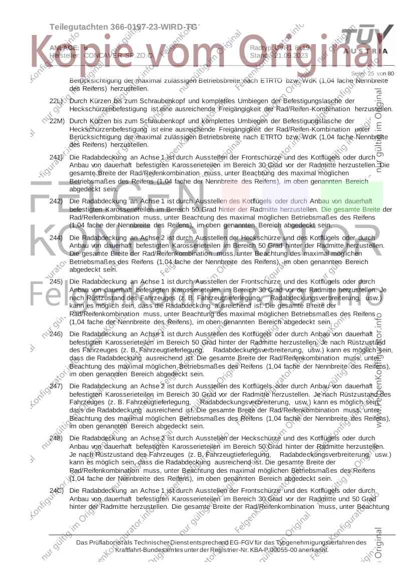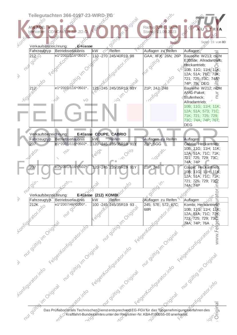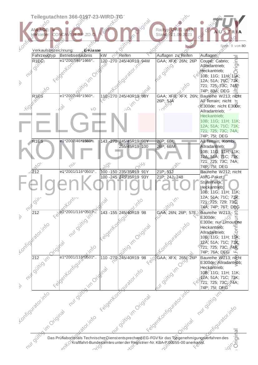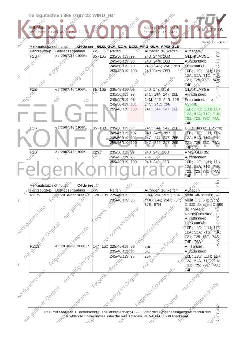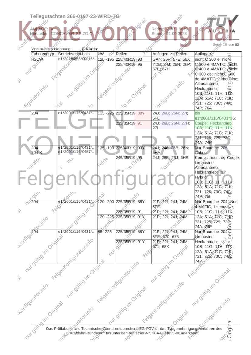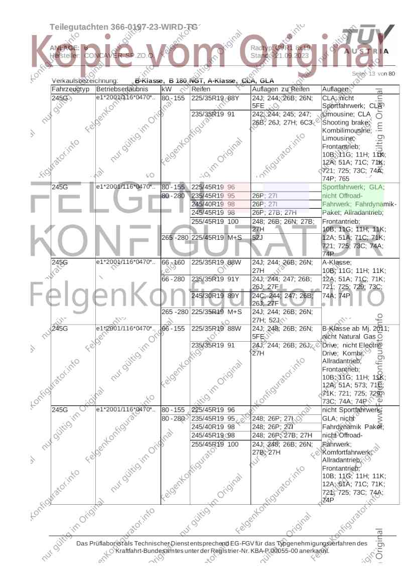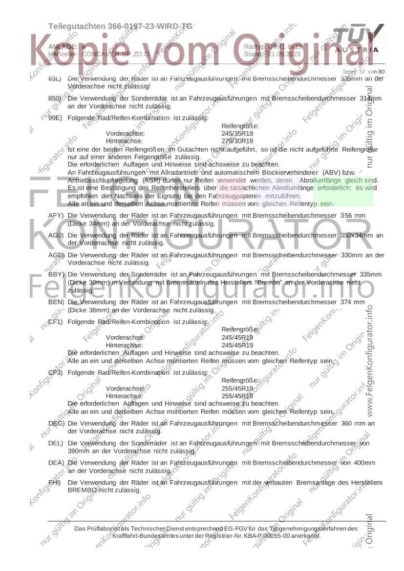 Teilegutachten 366-0197-23-WIRD-TG ANLAGE: 6 Radtyp: CVR1 8x19 Hersteller: CONCAVER SP.ZO.O. Stand: 21.09.2023 ______________________________________________________________________________________________________________ Seite: 1 von 80 Fahrzeughersteller AUDI, Bayerische Motorenwerke AG, BMW AG, DAIMLER, DAIMLER BENZ AG, DAIMLER (D), DB, MERCEDES, MERCEDES-AMG, MERCEDES-BENZ, Nissan International S. A., QUATTRO GmbH, SSANGYONG, Ssangyong Motor Co., Ltd. Raddaten: Radgröße nach Norm : 8 J X 19 H2 Einpreßtiefe (mm) : 36 Lochkreis (mm)/Lochzahl : 112/5 Zentrierart : Mittenzentrierung Technische Daten, Kurzfassung Ausführung Ausführungsbezeichnung Mittenl Zentrierring- zul. zul. gültig och werkstoff Rad- Abroll ab Kennzeichnung Kennzeichnung in mm last umf. Fertig Rad Zentrierring in kg in mm datum 511236666 CVR1 8x19 ET36 Ø72,6 - Ø66,6 66,6 Kunststoff 725 2300 04/22 Im Fahrzeug vorgeschriebene Fahrzeugsysteme, z. B. Reifendruckkontrollsysteme, müssen nach Anbau der Sonderräder funktionsfähig bleiben. Der Fahrzeughalter muss auf die Kontrolle des Anzugsmoments der Befestigungsmittel nach einer Wegstrecke von 50km hingewiesen werden. Verwendungsbereich/Fz-Hersteller : AUDI Befestigungsteile : Kegelbundschrauben M14x1,5, Schaftl. 28 mm, Kegelw. 60 Grad, für Typ : 4G1; B81; B8; F2; 4G Zubehör : Zentrierring: Ø72,6 - Ø66,6, Nabenkappe: 015-2 Befestigungsteile : Kegelbundschrauben M14x1,5, Schaftl. 30 mm, Kegelw. 60 Grad, für Typ : 8R2; 8R1; 8R; FY Zubehör : Zentrierring: Ø72,6 - Ø66,6, Nabenkappe: 015-2 Anzugsmoment der Befestigungsteile : 120 Nm für Typ : B8; B81; F2; 4G; 4G1 140 Nm für Typ : FY; F2; 8R; 8R1; 8R2 Das Prüflabor ist als Technischer Dienst entsprechend EG-FGV für das Typgenehmigungsverfahren des Kraftfahrt-Bundesamtes unter der Registrier-Nr. KBA-P 00055-00 anerkannt. Teilegutachten 366-0197-23-WIRD-TG ANLAGE: 6 Radtyp: CVR1 8x19 Hersteller: CONCAVER SP.ZO.O. Stand: 21.09.2023 ______________________________________________________________________________________________________________ Seite: 2 von 80 Verkaufsbezeichnung: AUDI A5,S5,A4,S4 Fahrzeugtyp Betriebserlaubnis kW Reifen Auflagen zu Reifen Auflagen B81 e13*2007/46*1084*.. 90 - 200 225/40R19 93W Nicht A4 Allroad 235/35R19 91Y Quattro; AUDI A4 (B9) 90 - 260 245/35R19 93Y 26P; 27I ab MJ2016; AUDI S4 260 225/40R19 M+S 52J (B9) ab MJ2016; Kombi; 235/35R19 M+S 52J Limousine; Allradantrieb; Frontantrieb; 10B; 11G; 11H; 11K; 12A; 51A; 71C; 71K; 721; 725; 73C; 74A; 74P; 77E; AG0 B81 e13*2007/46*1084*.. 88 - 195 235/35R19 91 22I; 51J AUDI A4 bis MJ2015; 245/35R19 93 YDE; 21P; 22I; 24J; Kombi; Frontantrieb; 24M; 51J 10B; 11G; 11H; 11K; 12A; 51A; 71C; 71K; 721; 725; 729; 73C; 74A; 74P; 76T; 77E; AG0 B81 e13*2007/46*1084*.. 100 - 200 235/35R19 91 22I; 5GG; 51J AUDI A4 bis MJ2015; 100 - 245 245/35R19 93 YDE; 21P; 22I; 24J; Nicht A4 Allroad 24M; 51J Quattro; AUDI S4 bis MJ2016; Kombi; Allradantrieb; 10B; 11G; 11H; 11K; 12A; 51A; 573; 71C; 71K; 721; 725; 729; 73C; 74A; 74P; 76T; 77E; AG0 Verkaufsbezeichnung: AUDI A5,S5,A4,S4, A4/A5 Avant/Sportback g-tron Fahrzeugtyp Betriebserlaubnis kW Reifen Auflagen zu Reifen Auflagen B8 e1*2001/116*0430*.. 90 - 200 225/40R19 93W Nicht A4 Allroad 235/35R19 91Y Quattro; AUDI A4 (B9) 90 - 260 245/35R19 93Y 26P; 27I ab MJ2016; AUDI S4 260 225/40R19 M+S 52J (B9) ab MJ2016; Kombi; 235/35R19 M+S 52J Limousine; Allradantrieb; Frontantrieb; 10B; 11G; 11H; 11K; 12A; 51A; 71C; 71K; 721; 725; 73C; 74A; 74P; 77E; AG0 B8 e1*2001/116*0430*.. 88 - 195 235/35R19 91 22I; 51J AUDI A4 bis MJ2015; 245/35R19 93 YDE; 21P; 22I; 24J; Limousine; 24M; 51J Frontantrieb; 10B; 11G; 11H; 11K; 12A; 51A; 71C; 71K; 721; 725; 729; 73C; 74A; 74P; 76T; 77E; AG0 Das Prüflabor ist als Technischer Dienst entsprechend EG-FGV für das Typgenehmigungsverfahren des Kraftfahrt-Bundesamtes unter der Registrier-Nr. KBA-P 00055-00 anerkannt. Teilegutachten 366-0197-23-WIRD-TG ANLAGE: 6 Radtyp: CVR1 8x19 Hersteller: CONCAVER SP.ZO.O. Stand: 21.09.2023 ______________________________________________________________________________________________________________ Seite: 3 von 80 Verkaufsbezeichnung: AUDI A5,S5,A4,S4, A4/A5 Avant/Sportback g-tron Fahrzeugtyp Betriebserlaubnis kW Reifen Auflagen zu Reifen Auflagen B8 e1*2001/116*0430*.. 88 - 195 235/35R19 91 22I; 51J AUDI A4 bis MJ2015; 245/35R19 93 YDE; 21P; 22I; 24J; Kombi; Frontantrieb; 24M; 51J 10B; 11G; 11H; 11K; 12A; 51A; 71C; 71K; 721; 725; 729; 73C; 74A; 74P; 76T; 77E; AG0 B8 e1*2001/116*0430*.. 100 - 200 235/35R19 91 22I; 51J AUDI A4 bis MJ2015; 100 - 245 245/35R19 93 YDE; 21P; 22I; 24J; AUDI S4 bis MJ2016; 24M; 51J Limousine; Allradantrieb; 10B; 11G; 11H; 11K; 12A; 51A; 573; 71C; 71K; 721; 725; 729; 73C; 74A; 74P; 76T; 77E; AG0 B8 e1*2001/116*0430*.. 100 - 200 235/35R19 91 22I; 5GG; 51J AUDI A4 bis MJ2015; 100 - 245 245/35R19 93 YDE; 21P; 22I; 24J; Nicht A4 Allroad 24M; 51J Quattro; AUDI S4 bis MJ2016; Kombi; Allradantrieb; 10B; 11G; 11H; 11K; 12A; 51A; 573; 71C; 71K; 721; 725; 729; 73C; 74A; 74P; 76T; 77E; AG0 Verkaufsbezeichnung: AUDI Q5 Fahrzeugtyp Betriebserlaubnis kW Reifen Auflagen zu Reifen Auflagen 8R e13*2007/46*1083*.. 100 - 260 235/55R19 101 10B; 11G; 11H; 11K; 245/50R19 101 12A; 51A; 573; 71C; 71K; 721; 725; 73C; 74A; 74P; PDI Verkaufsbezeichnung: AUDI Q5 HYBRID Fahrzeugtyp Betriebserlaubnis kW Reifen Auflagen zu Reifen Auflagen 8R2 e13*2007/46*1179*.. 100 - 260 235/55R19 101 10B; 11G; 11H; 11K; 245/50R19 101 12A; 51A; 573; 71C; 71K; 721; 725; 73C; 74A; 74P; PDI Verkaufsbezeichnung: AUDI Q5,SQ5,SQ5 TDI Fahrzeugtyp Betriebserlaubnis kW Reifen Auflagen zu Reifen Auflagen 8R e1*2001/116*0473*.. 100 - 260 235/55R19 101 10B; 11G; 11H; 11K; 245/50R19 101 12A; 51A; 573; 71C; 71K; 721; 725; 73C; 74A; 74P; PDI Das Prüflabor ist als Technischer Dienst entsprechend EG-FGV für das Typgenehmigungsverfahren des Kraftfahrt-Bundesamtes unter der Registrier-Nr. KBA-P 00055-00 anerkannt. Teilegutachten 366-0197-23-WIRD-TG ANLAGE: 6 Radtyp: CVR1 8x19 Hersteller: CONCAVER SP.
