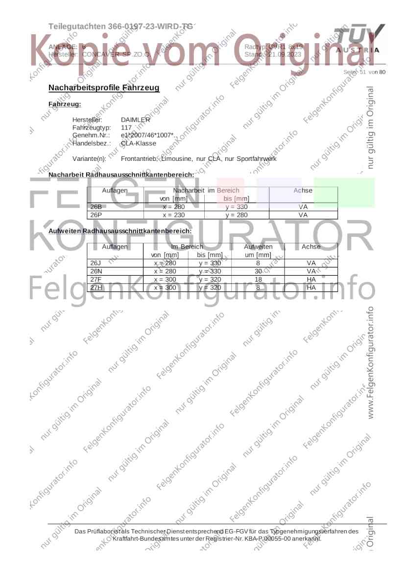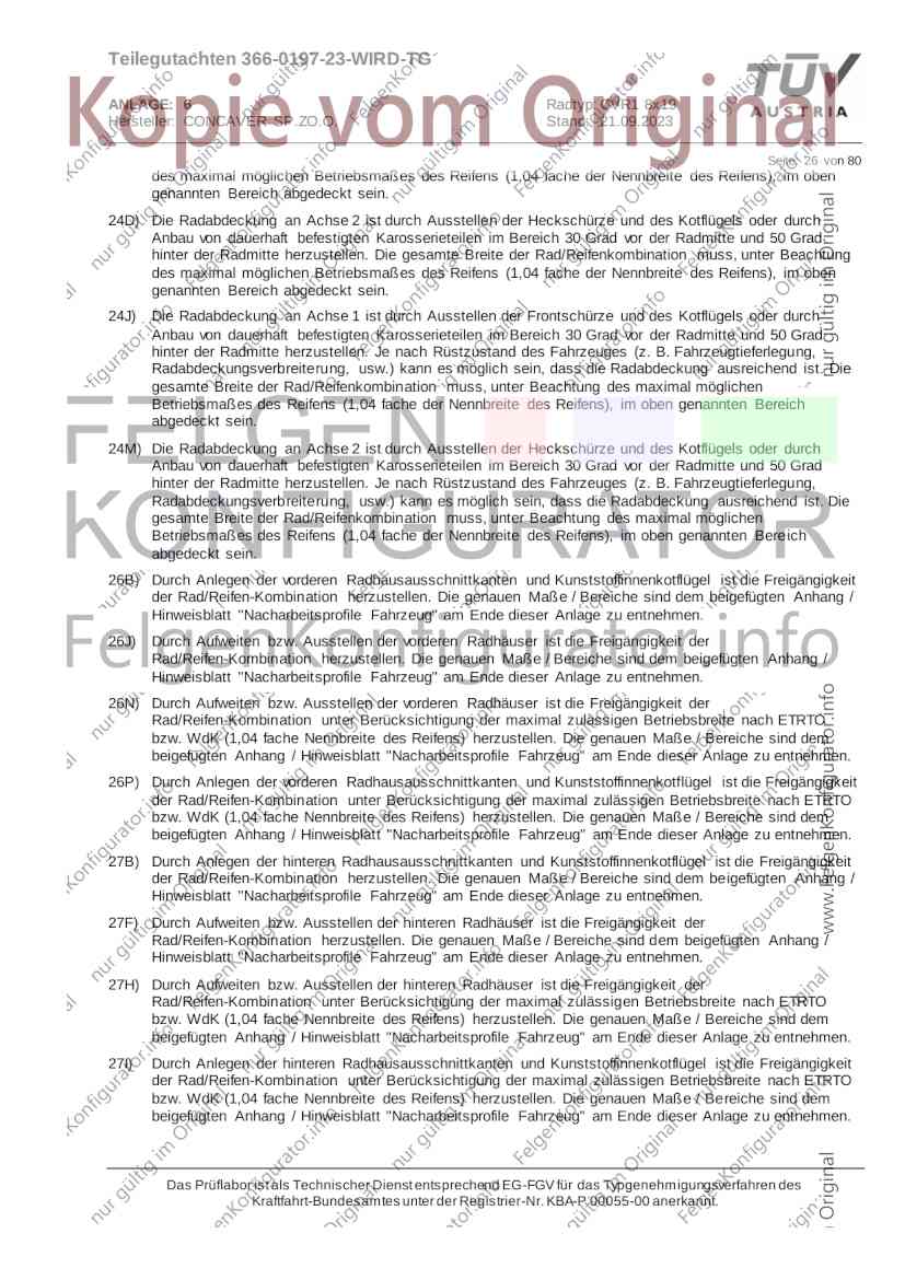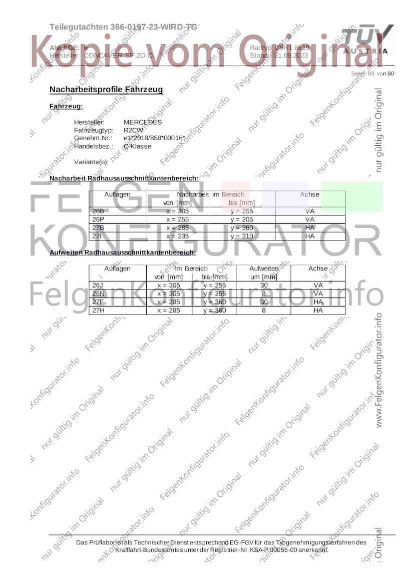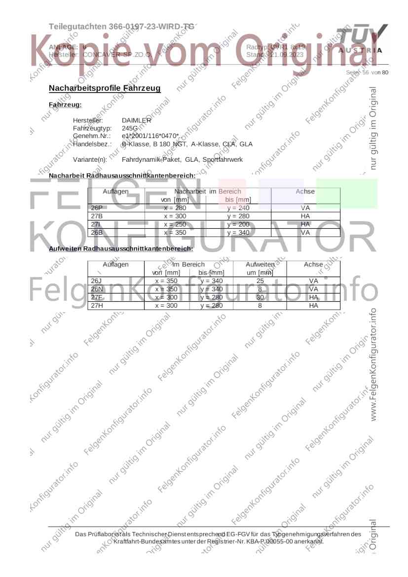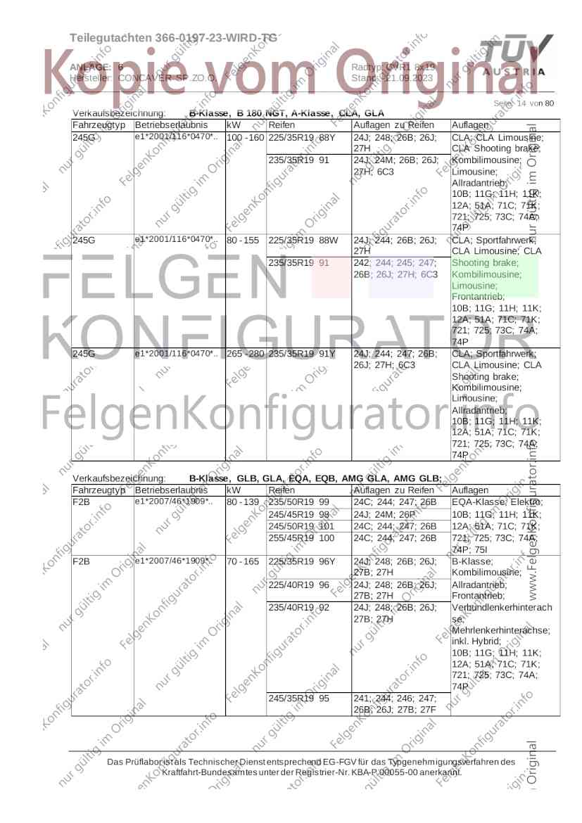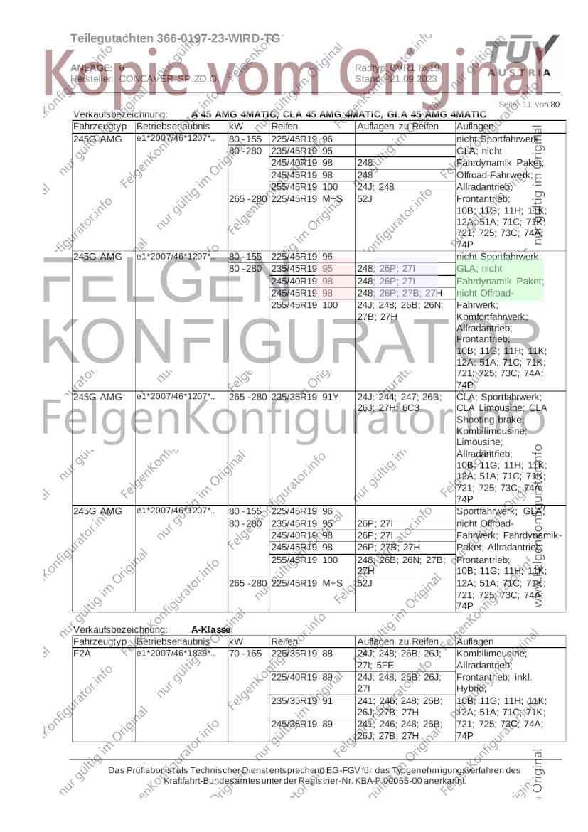Teilegutachten 366-0197-23-WIRD-TG ANLAGE: 6 Radtyp: CVR1 8x19 Hersteller: CONCAVER SP.ZO.O. Stand: 21.09.2023 ______________________________________________________________________________________________________________ Seite: 1 von 80 Fahrzeughersteller AUDI, Bayerische Motorenwerke AG, BMW AG, DAIMLER, DAIMLER BENZ AG, DAIMLER (D), DB, MERCEDES, MERCEDES-AMG, MERCEDES-BENZ, Nissan International S. A., QUATTRO GmbH, SSANGYONG, Ssangyong Motor Co., Ltd. Raddaten: Radgröße nach Norm : 8 J X 19 H2 Einpreßtiefe (mm) : 36 Lochkreis (mm)/Lochzahl : 112/5 Zentrierart : Mittenzentrierung Technische Daten, Kurzfassung Ausführung Ausführungsbezeichnung Mittenl Zentrierring- zul. zul. gültig och werkstoff Rad- Abroll ab Kennzeichnung Kennzeichnung in mm last umf. Fertig Rad Zentrierring in kg in mm datum 511236666 CVR1 8x19 ET36 Ø72,6 - Ø66,6 66,6 Kunststoff 725 2300 04/22 Im Fahrzeug vorgeschriebene Fahrzeugsysteme, z. B. Reifendruckkontrollsysteme, müssen nach Anbau der Sonderräder funktionsfähig bleiben. Der Fahrzeughalter muss auf die Kontrolle des Anzugsmoments der Befestigungsmittel nach einer Wegstrecke von 50km hingewiesen werden. Verwendungsbereich/Fz-Hersteller : AUDI Befestigungsteile : Kegelbundschrauben M14x1,5, Schaftl. 28 mm, Kegelw. 60 Grad, für Typ : 4G1; B81; B8; F2; 4G Zubehör : Zentrierring: Ø72,6 - Ø66,6, Nabenkappe: 015-2 Befestigungsteile : Kegelbundschrauben M14x1,5, Schaftl. 30 mm, Kegelw. 60 Grad, für Typ : 8R2; 8R1; 8R; FY Zubehör : Zentrierring: Ø72,6 - Ø66,6, Nabenkappe: 015-2 Anzugsmoment der Befestigungsteile : 120 Nm für Typ : B8; B81; F2; 4G; 4G1 140 Nm für Typ : FY; F2; 8R; 8R1; 8R2 Das Prüflabor ist als Technischer Dienst entsprechend EG-FGV für das Typgenehmigungsverfahren des Kraftfahrt-Bundesamtes unter der Registrier-Nr. KBA-P 00055-00 anerkannt. Teilegutachten 366-0197-23-WIRD-TG ANLAGE: 6 Radtyp: CVR1 8x19 Hersteller: CONCAVER SP.ZO.O. Stand: 21.09.2023 ______________________________________________________________________________________________________________ Seite: 2 von 80 Verkaufsbezeichnung: AUDI A5,S5,A4,S4 Fahrzeugtyp Betriebserlaubnis kW Reifen Auflagen zu Reifen Auflagen B81 e13*2007/46*1084*.. 90 - 200 225/40R19 93W Nicht A4 Allroad 235/35R19 91Y Quattro; AUDI A4 (B9) 90 - 260 245/35R19 93Y 26P; 27I ab MJ2016; AUDI S4 260 225/40R19 M+S 52J (B9) ab MJ2016; Kombi; 235/35R19 M+S 52J Limousine; Allradantrieb; Frontantrieb; 10B; 11G; 11H; 11K; 12A; 51A; 71C; 71K; 721; 725; 73C; 74A; 74P; 77E; AG0 B81 e13*2007/46*1084*.. 88 - 195 235/35R19 91 22I; 51J AUDI A4 bis MJ2015; 245/35R19 93 YDE; 21P; 22I; 24J; Kombi; Frontantrieb; 24M; 51J 10B; 11G; 11H; 11K; 12A; 51A; 71C; 71K; 721; 725; 729; 73C; 74A; 74P; 76T; 77E; AG0 B81 e13*2007/46*1084*.. 100 - 200 235/35R19 91 22I; 5GG; 51J AUDI A4 bis MJ2015; 100 - 245 245/35R19 93 YDE; 21P; 22I; 24J; Nicht A4 Allroad 24M; 51J Quattro; AUDI S4 bis MJ2016; Kombi; Allradantrieb; 10B; 11G; 11H; 11K; 12A; 51A; 573; 71C; 71K; 721; 725; 729; 73C; 74A; 74P; 76T; 77E; AG0 Verkaufsbezeichnung: AUDI A5,S5,A4,S4, A4/A5 Avant/Sportback g-tron Fahrzeugtyp Betriebserlaubnis kW Reifen Auflagen zu Reifen Auflagen B8 e1*2001/116*0430*.. 90 - 200 225/40R19 93W Nicht A4 Allroad 235/35R19 91Y Quattro; AUDI A4 (B9) 90 - 260 245/35R19 93Y 26P; 27I ab MJ2016; AUDI S4 260 225/40R19 M+S 52J (B9) ab MJ2016; Kombi; 235/35R19 M+S 52J Limousine; Allradantrieb; Frontantrieb; 10B; 11G; 11H; 11K; 12A; 51A; 71C; 71K; 721; 725; 73C; 74A; 74P; 77E; AG0 B8 e1*2001/116*0430*.. 88 - 195 235/35R19 91 22I; 51J AUDI A4 bis MJ2015; 245/35R19 93 YDE; 21P; 22I; 24J; Limousine; 24M; 51J Frontantrieb; 10B; 11G; 11H; 11K; 12A; 51A; 71C; 71K; 721; 725; 729; 73C; 74A; 74P; 76T; 77E; AG0 Das Prüflabor ist als Technischer Dienst entsprechend EG-FGV für das Typgenehmigungsverfahren des Kraftfahrt-Bundesamtes unter der Registrier-Nr. KBA-P 00055-00 anerkannt. Teilegutachten 366-0197-23-WIRD-TG ANLAGE: 6 Radtyp: CVR1 8x19 Hersteller: CONCAVER SP.ZO.O. Stand: 21.09.2023 ______________________________________________________________________________________________________________ Seite: 3 von 80 Verkaufsbezeichnung: AUDI A5,S5,A4,S4, A4/A5 Avant/Sportback g-tron Fahrzeugtyp Betriebserlaubnis kW Reifen Auflagen zu Reifen Auflagen B8 e1*2001/116*0430*.. 88 - 195 235/35R19 91 22I; 51J AUDI A4 bis MJ2015; 245/35R19 93 YDE; 21P; 22I; 24J; Kombi; Frontantrieb; 24M; 51J 10B; 11G; 11H; 11K; 12A; 51A; 71C; 71K; 721; 725; 729; 73C; 74A; 74P; 76T; 77E; AG0 B8 e1*2001/116*0430*.. 100 - 200 235/35R19 91 22I; 51J AUDI A4 bis MJ2015; 100 - 245 245/35R19 93 YDE; 21P; 22I; 24J; AUDI S4 bis MJ2016; 24M; 51J Limousine; Allradantrieb; 10B; 11G; 11H; 11K; 12A; 51A; 573; 71C; 71K; 721; 725; 729; 73C; 74A; 74P; 76T; 77E; AG0 B8 e1*2001/116*0430*.. 100 - 200 235/35R19 91 22I; 5GG; 51J AUDI A4 bis MJ2015; 100 - 245 245/35R19 93 YDE; 21P; 22I; 24J; Nicht A4 Allroad 24M; 51J Quattro; AUDI S4 bis MJ2016; Kombi; Allradantrieb; 10B; 11G; 11H; 11K; 12A; 51A; 573; 71C; 71K; 721; 725; 729; 73C; 74A; 74P; 76T; 77E; AG0 Verkaufsbezeichnung: AUDI Q5 Fahrzeugtyp Betriebserlaubnis kW Reifen Auflagen zu Reifen Auflagen 8R e13*2007/46*1083*.. 100 - 260 235/55R19 101 10B; 11G; 11H; 11K; 245/50R19 101 12A; 51A; 573; 71C; 71K; 721; 725; 73C; 74A; 74P; PDI Verkaufsbezeichnung: AUDI Q5 HYBRID Fahrzeugtyp Betriebserlaubnis kW Reifen Auflagen zu Reifen Auflagen 8R2 e13*2007/46*1179*.. 100 - 260 235/55R19 101 10B; 11G; 11H; 11K; 245/50R19 101 12A; 51A; 573; 71C; 71K; 721; 725; 73C; 74A; 74P; PDI Verkaufsbezeichnung: AUDI Q5,SQ5,SQ5 TDI Fahrzeugtyp Betriebserlaubnis kW Reifen Auflagen zu Reifen Auflagen 8R e1*2001/116*0473*.. 100 - 260 235/55R19 101 10B; 11G; 11H; 11K; 245/50R19 101 12A; 51A; 573; 71C; 71K; 721; 725; 73C; 74A; 74P; PDI Das Prüflabor ist als Technischer Dienst entsprechend EG-FGV für das Typgenehmigungsverfahren des Kraftfahrt-Bundesamtes unter der Registrier-Nr. KBA-P 00055-00 anerkannt. Teilegutachten 366-0197-23-WIRD-TG ANLAGE: 6 Radtyp: CVR1 8x19 Hersteller: CONCAVER SP.