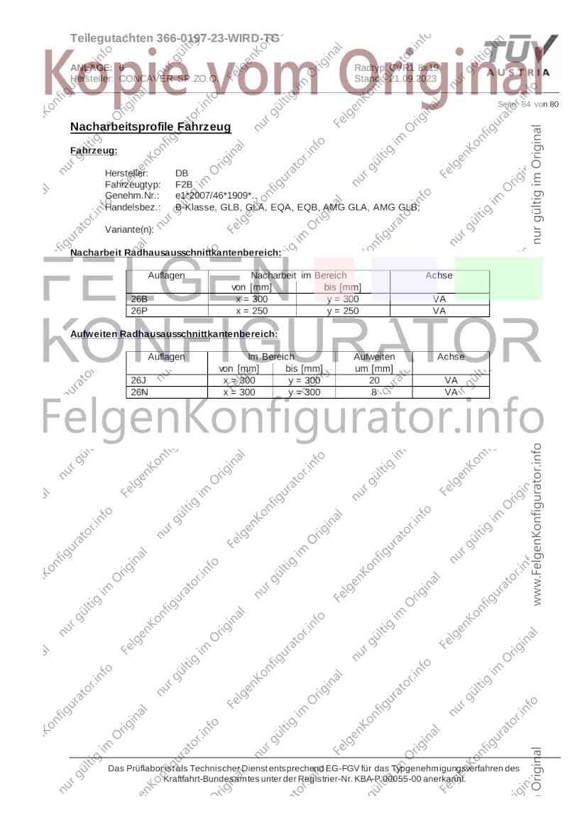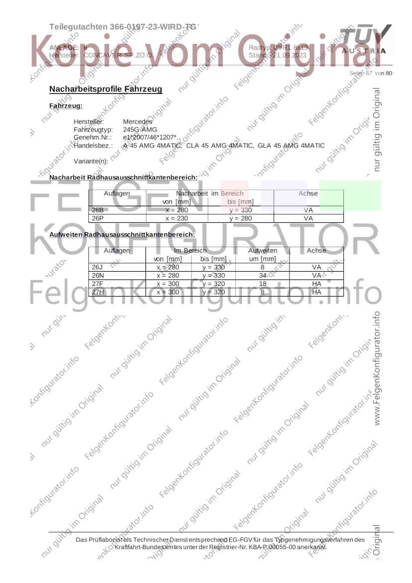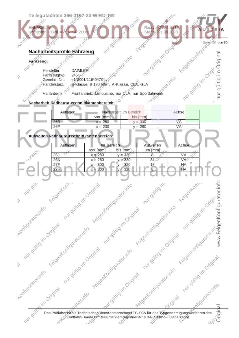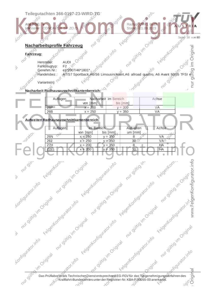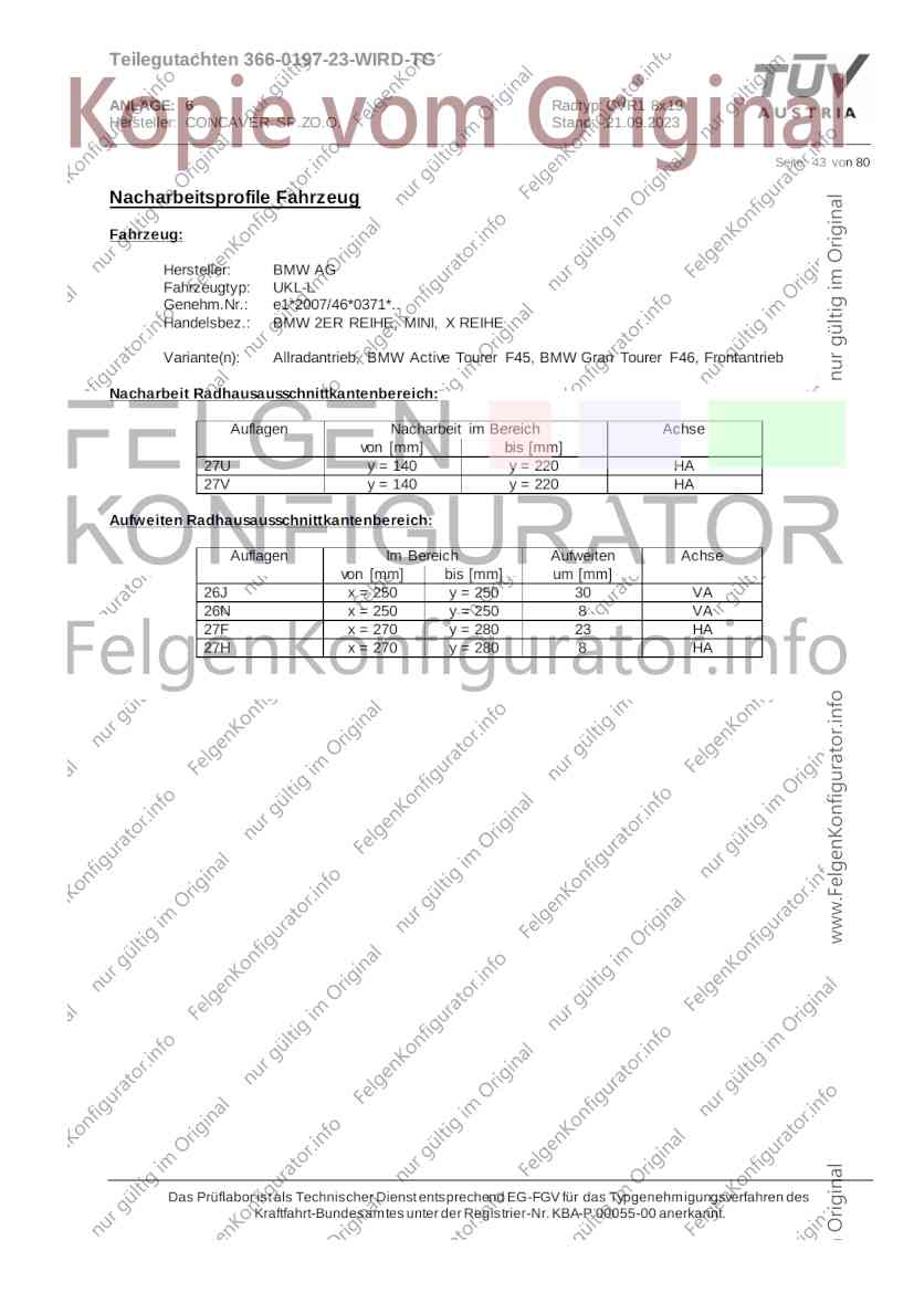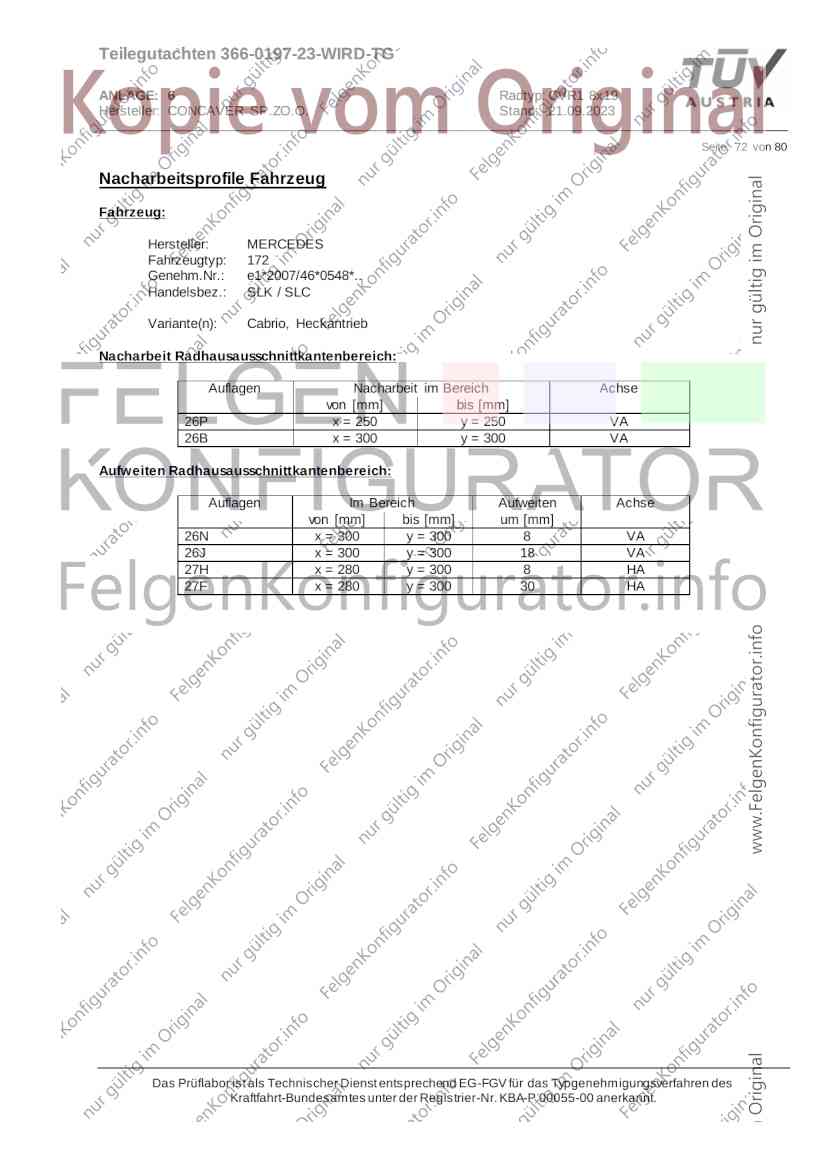 Teilegutachten 366-0197-23-WIRD-TG ANLAGE: 6 Radtyp: CVR1 8x19 Hersteller: CONCAVER SP.ZO.O. Stand: 21.09.2023 ______________________________________________________________________________________________________________ Seite: 1 von 80 Fahrzeughersteller AUDI, Bayerische Motorenwerke AG, BMW AG, DAIMLER, DAIMLER BENZ AG, DAIMLER (D), DB, MERCEDES, MERCEDES-AMG, MERCEDES-BENZ, Nissan International S. A., QUATTRO GmbH, SSANGYONG, Ssangyong Motor Co., Ltd. Raddaten: Radgröße nach Norm : 8 J X 19 H2 Einpreßtiefe (mm) : 36 Lochkreis (mm)/Lochzahl : 112/5 Zentrierart : Mittenzentrierung Technische Daten, Kurzfassung Ausführung Ausführungsbezeichnung Mittenl Zentrierring- zul. zul. gültig och werkstoff Rad- Abroll ab Kennzeichnung Kennzeichnung in mm last umf. Fertig Rad Zentrierring in kg in mm datum 511236666 CVR1 8x19 ET36 Ø72,6 - Ø66,6 66,6 Kunststoff 725 2300 04/22 Im Fahrzeug vorgeschriebene Fahrzeugsysteme, z. B. Reifendruckkontrollsysteme, müssen nach Anbau der Sonderräder funktionsfähig bleiben. Der Fahrzeughalter muss auf die Kontrolle des Anzugsmoments der Befestigungsmittel nach einer Wegstrecke von 50km hingewiesen werden. Verwendungsbereich/Fz-Hersteller : AUDI Befestigungsteile : Kegelbundschrauben M14x1,5, Schaftl. 28 mm, Kegelw. 60 Grad, für Typ : 4G1; B81; B8; F2; 4G Zubehör : Zentrierring: Ø72,6 - Ø66,6, Nabenkappe: 015-2 Befestigungsteile : Kegelbundschrauben M14x1,5, Schaftl. 30 mm, Kegelw. 60 Grad, für Typ : 8R2; 8R1; 8R; FY Zubehör : Zentrierring: Ø72,6 - Ø66,6, Nabenkappe: 015-2 Anzugsmoment der Befestigungsteile : 120 Nm für Typ : B8; B81; F2; 4G; 4G1 140 Nm für Typ : FY; F2; 8R; 8R1; 8R2 Das Prüflabor ist als Technischer Dienst entsprechend EG-FGV für das Typgenehmigungsverfahren des Kraftfahrt-Bundesamtes unter der Registrier-Nr. KBA-P 00055-00 anerkannt. Teilegutachten 366-0197-23-WIRD-TG ANLAGE: 6 Radtyp: CVR1 8x19 Hersteller: CONCAVER SP.ZO.O. Stand: 21.09.2023 ______________________________________________________________________________________________________________ Seite: 2 von 80 Verkaufsbezeichnung: AUDI A5,S5,A4,S4 Fahrzeugtyp Betriebserlaubnis kW Reifen Auflagen zu Reifen Auflagen B81 e13*2007/46*1084*.. 90 - 200 225/40R19 93W Nicht A4 Allroad 235/35R19 91Y Quattro; AUDI A4 (B9) 90 - 260 245/35R19 93Y 26P; 27I ab MJ2016; AUDI S4 260 225/40R19 M+S 52J (B9) ab MJ2016; Kombi; 235/35R19 M+S 52J Limousine; Allradantrieb; Frontantrieb; 10B; 11G; 11H; 11K; 12A; 51A; 71C; 71K; 721; 725; 73C; 74A; 74P; 77E; AG0 B81 e13*2007/46*1084*.. 88 - 195 235/35R19 91 22I; 51J AUDI A4 bis MJ2015; 245/35R19 93 YDE; 21P; 22I; 24J; Kombi; Frontantrieb; 24M; 51J 10B; 11G; 11H; 11K; 12A; 51A; 71C; 71K; 721; 725; 729; 73C; 74A; 74P; 76T; 77E; AG0 B81 e13*2007/46*1084*.. 100 - 200 235/35R19 91 22I; 5GG; 51J AUDI A4 bis MJ2015; 100 - 245 245/35R19 93 YDE; 21P; 22I; 24J; Nicht A4 Allroad 24M; 51J Quattro; AUDI S4 bis MJ2016; Kombi; Allradantrieb; 10B; 11G; 11H; 11K; 12A; 51A; 573; 71C; 71K; 721; 725; 729; 73C; 74A; 74P; 76T; 77E; AG0 Verkaufsbezeichnung: AUDI A5,S5,A4,S4, A4/A5 Avant/Sportback g-tron Fahrzeugtyp Betriebserlaubnis kW Reifen Auflagen zu Reifen Auflagen B8 e1*2001/116*0430*.. 90 - 200 225/40R19 93W Nicht A4 Allroad 235/35R19 91Y Quattro; AUDI A4 (B9) 90 - 260 245/35R19 93Y 26P; 27I ab MJ2016; AUDI S4 260 225/40R19 M+S 52J (B9) ab MJ2016; Kombi; 235/35R19 M+S 52J Limousine; Allradantrieb; Frontantrieb; 10B; 11G; 11H; 11K; 12A; 51A; 71C; 71K; 721; 725; 73C; 74A; 74P; 77E; AG0 B8 e1*2001/116*0430*.. 88 - 195 235/35R19 91 22I; 51J AUDI A4 bis MJ2015; 245/35R19 93 YDE; 21P; 22I; 24J; Limousine; 24M; 51J Frontantrieb; 10B; 11G; 11H; 11K; 12A; 51A; 71C; 71K; 721; 725; 729; 73C; 74A; 74P; 76T; 77E; AG0 Das Prüflabor ist als Technischer Dienst entsprechend EG-FGV für das Typgenehmigungsverfahren des Kraftfahrt-Bundesamtes unter der Registrier-Nr. KBA-P 00055-00 anerkannt. Teilegutachten 366-0197-23-WIRD-TG ANLAGE: 6 Radtyp: CVR1 8x19 Hersteller: CONCAVER SP.ZO.O. Stand: 21.09.2023 ______________________________________________________________________________________________________________ Seite: 3 von 80 Verkaufsbezeichnung: AUDI A5,S5,A4,S4, A4/A5 Avant/Sportback g-tron Fahrzeugtyp Betriebserlaubnis kW Reifen Auflagen zu Reifen Auflagen B8 e1*2001/116*0430*.. 88 - 195 235/35R19 91 22I; 51J AUDI A4 bis MJ2015; 245/35R19 93 YDE; 21P; 22I; 24J; Kombi; Frontantrieb; 24M; 51J 10B; 11G; 11H; 11K; 12A; 51A; 71C; 71K; 721; 725; 729; 73C; 74A; 74P; 76T; 77E; AG0 B8 e1*2001/116*0430*.. 100 - 200 235/35R19 91 22I; 51J AUDI A4 bis MJ2015; 100 - 245 245/35R19 93 YDE; 21P; 22I; 24J; AUDI S4 bis MJ2016; 24M; 51J Limousine; Allradantrieb; 10B; 11G; 11H; 11K; 12A; 51A; 573; 71C; 71K; 721; 725; 729; 73C; 74A; 74P; 76T; 77E; AG0 B8 e1*2001/116*0430*.. 100 - 200 235/35R19 91 22I; 5GG; 51J AUDI A4 bis MJ2015; 100 - 245 245/35R19 93 YDE; 21P; 22I; 24J; Nicht A4 Allroad 24M; 51J Quattro; AUDI S4 bis MJ2016; Kombi; Allradantrieb; 10B; 11G; 11H; 11K; 12A; 51A; 573; 71C; 71K; 721; 725; 729; 73C; 74A; 74P; 76T; 77E; AG0 Verkaufsbezeichnung: AUDI Q5 Fahrzeugtyp Betriebserlaubnis kW Reifen Auflagen zu Reifen Auflagen 8R e13*2007/46*1083*.. 100 - 260 235/55R19 101 10B; 11G; 11H; 11K; 245/50R19 101 12A; 51A; 573; 71C; 71K; 721; 725; 73C; 74A; 74P; PDI Verkaufsbezeichnung: AUDI Q5 HYBRID Fahrzeugtyp Betriebserlaubnis kW Reifen Auflagen zu Reifen Auflagen 8R2 e13*2007/46*1179*.. 100 - 260 235/55R19 101 10B; 11G; 11H; 11K; 245/50R19 101 12A; 51A; 573; 71C; 71K; 721; 725; 73C; 74A; 74P; PDI Verkaufsbezeichnung: AUDI Q5,SQ5,SQ5 TDI Fahrzeugtyp Betriebserlaubnis kW Reifen Auflagen zu Reifen Auflagen 8R e1*2001/116*0473*.. 100 - 260 235/55R19 101 10B; 11G; 11H; 11K; 245/50R19 101 12A; 51A; 573; 71C; 71K; 721; 725; 73C; 74A; 74P; PDI Das Prüflabor ist als Technischer Dienst entsprechend EG-FGV für das Typgenehmigungsverfahren des Kraftfahrt-Bundesamtes unter der Registrier-Nr. KBA-P 00055-00 anerkannt. Teilegutachten 366-0197-23-WIRD-TG ANLAGE: 6 Radtyp: CVR1 8x19 Hersteller: CONCAVER SP.