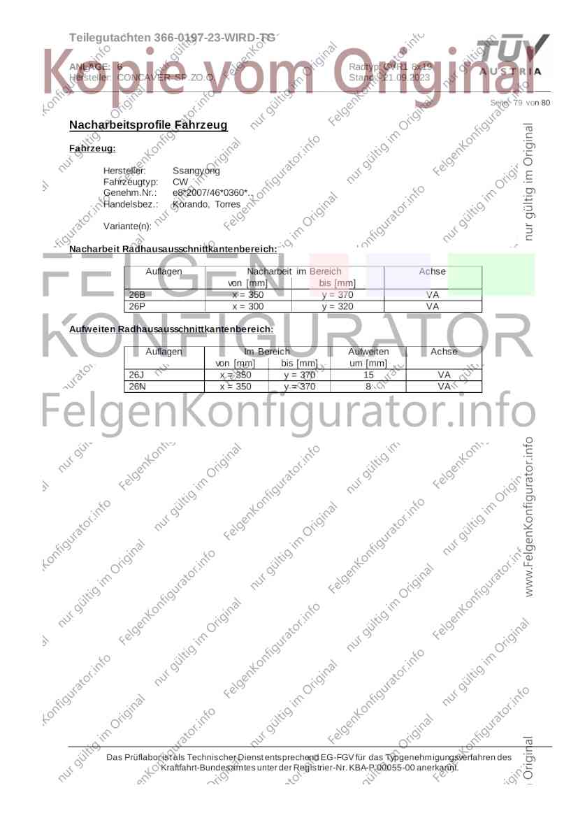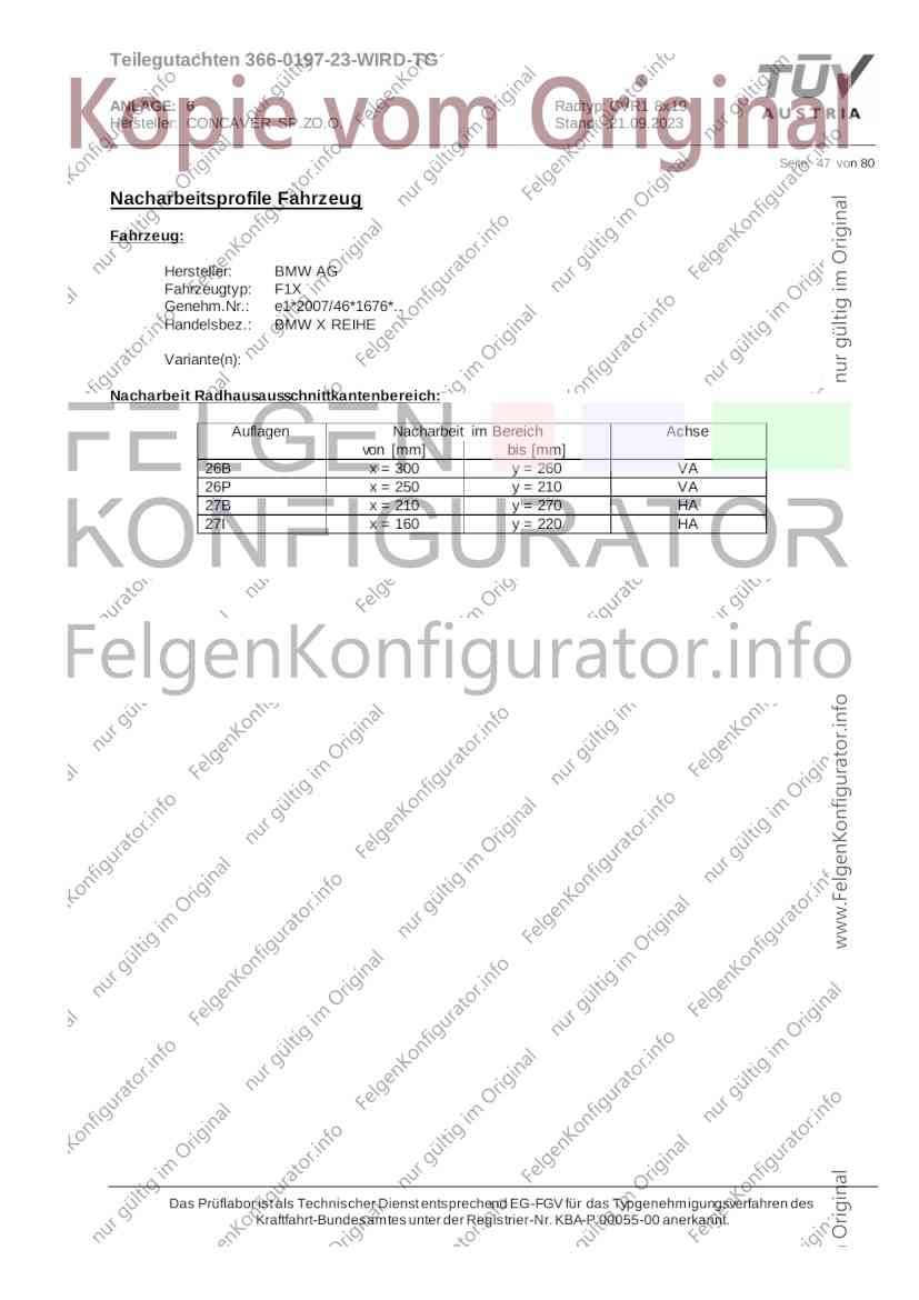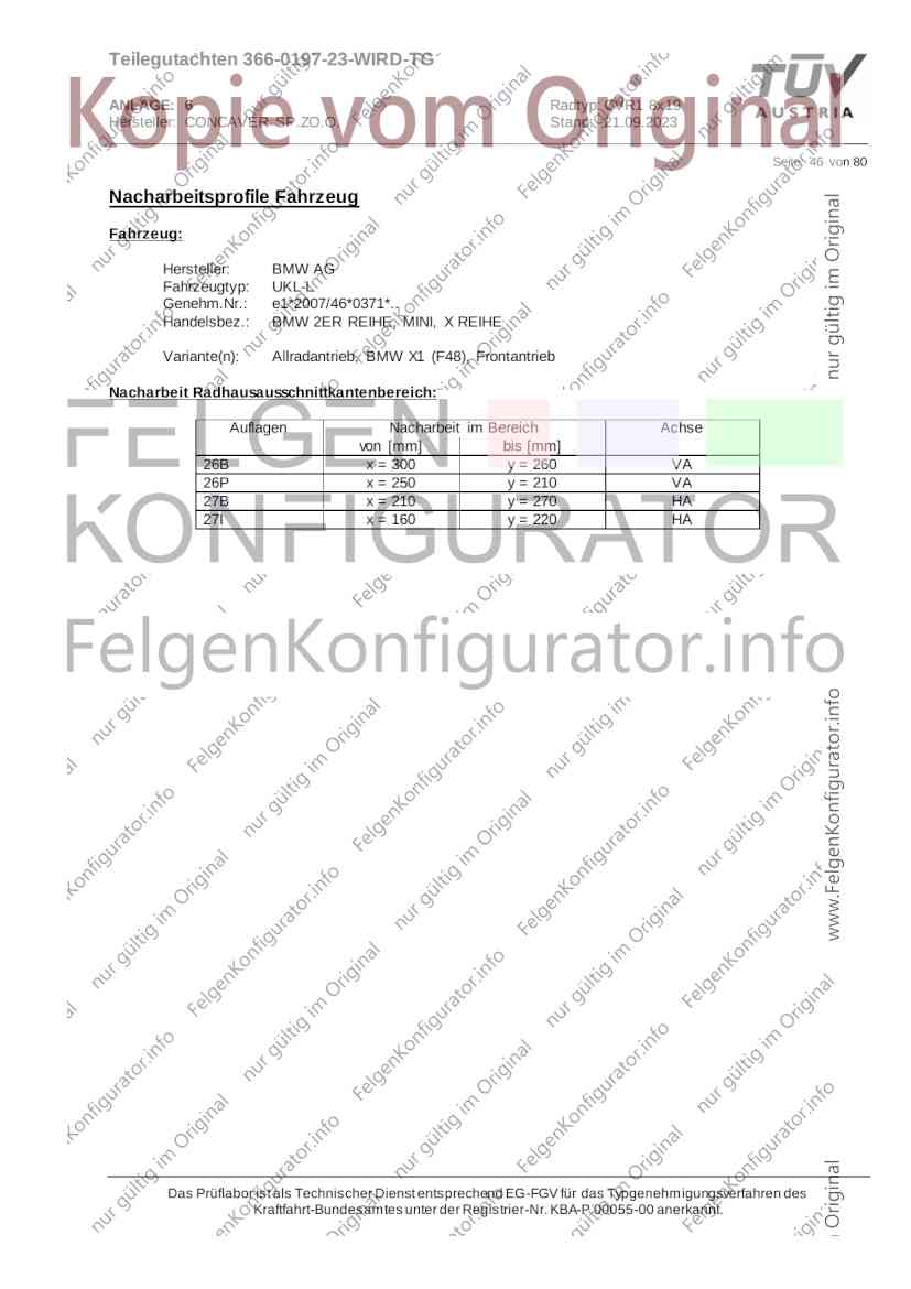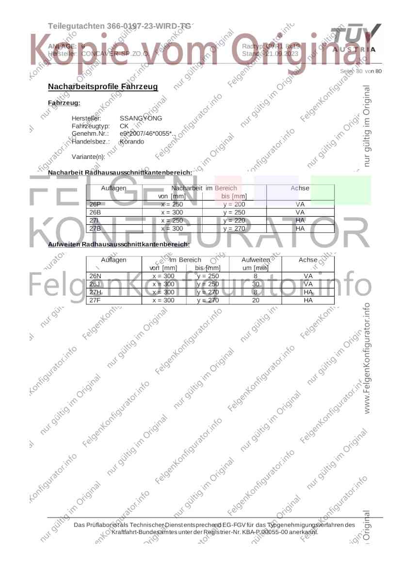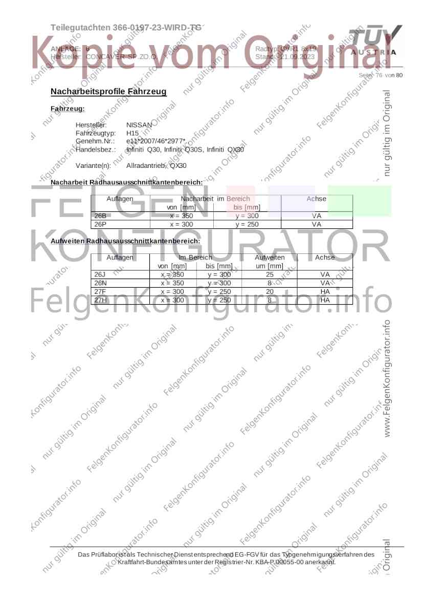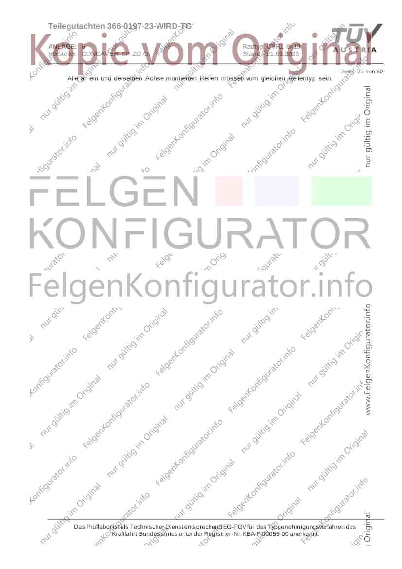 Teilegutachten 366-0197-23-WIRD-TG ANLAGE: 6 Radtyp: CVR1 8x19 Hersteller: CONCAVER SP.ZO.O. Stand: 21.09.2023 ______________________________________________________________________________________________________________ Seite: 1 von 80 Fahrzeughersteller AUDI, Bayerische Motorenwerke AG, BMW AG, DAIMLER, DAIMLER BENZ AG, DAIMLER (D), DB, MERCEDES, MERCEDES-AMG, MERCEDES-BENZ, Nissan International S. A., QUATTRO GmbH, SSANGYONG, Ssangyong Motor Co., Ltd. Raddaten: Radgröße nach Norm : 8 J X 19 H2 Einpreßtiefe (mm) : 36 Lochkreis (mm)/Lochzahl : 112/5 Zentrierart : Mittenzentrierung Technische Daten, Kurzfassung Ausführung Ausführungsbezeichnung Mittenl Zentrierring- zul. zul. gültig och werkstoff Rad- Abroll ab Kennzeichnung Kennzeichnung in mm last umf. Fertig Rad Zentrierring in kg in mm datum 511236666 CVR1 8x19 ET36 Ø72,6 - Ø66,6 66,6 Kunststoff 725 2300 04/22 Im Fahrzeug vorgeschriebene Fahrzeugsysteme, z. B. Reifendruckkontrollsysteme, müssen nach Anbau der Sonderräder funktionsfähig bleiben. Der Fahrzeughalter muss auf die Kontrolle des Anzugsmoments der Befestigungsmittel nach einer Wegstrecke von 50km hingewiesen werden. Verwendungsbereich/Fz-Hersteller : AUDI Befestigungsteile : Kegelbundschrauben M14x1,5, Schaftl. 28 mm, Kegelw. 60 Grad, für Typ : 4G1; B81; B8; F2; 4G Zubehör : Zentrierring: Ø72,6 - Ø66,6, Nabenkappe: 015-2 Befestigungsteile : Kegelbundschrauben M14x1,5, Schaftl. 30 mm, Kegelw. 60 Grad, für Typ : 8R2; 8R1; 8R; FY Zubehör : Zentrierring: Ø72,6 - Ø66,6, Nabenkappe: 015-2 Anzugsmoment der Befestigungsteile : 120 Nm für Typ : B8; B81; F2; 4G; 4G1 140 Nm für Typ : FY; F2; 8R; 8R1; 8R2 Das Prüflabor ist als Technischer Dienst entsprechend EG-FGV für das Typgenehmigungsverfahren des Kraftfahrt-Bundesamtes unter der Registrier-Nr. KBA-P 00055-00 anerkannt. Teilegutachten 366-0197-23-WIRD-TG ANLAGE: 6 Radtyp: CVR1 8x19 Hersteller: CONCAVER SP.ZO.O. Stand: 21.09.2023 ______________________________________________________________________________________________________________ Seite: 2 von 80 Verkaufsbezeichnung: AUDI A5,S5,A4,S4 Fahrzeugtyp Betriebserlaubnis kW Reifen Auflagen zu Reifen Auflagen B81 e13*2007/46*1084*.. 90 - 200 225/40R19 93W Nicht A4 Allroad 235/35R19 91Y Quattro; AUDI A4 (B9) 90 - 260 245/35R19 93Y 26P; 27I ab MJ2016; AUDI S4 260 225/40R19 M+S 52J (B9) ab MJ2016; Kombi; 235/35R19 M+S 52J Limousine; Allradantrieb; Frontantrieb; 10B; 11G; 11H; 11K; 12A; 51A; 71C; 71K; 721; 725; 73C; 74A; 74P; 77E; AG0 B81 e13*2007/46*1084*.. 88 - 195 235/35R19 91 22I; 51J AUDI A4 bis MJ2015; 245/35R19 93 YDE; 21P; 22I; 24J; Kombi; Frontantrieb; 24M; 51J 10B; 11G; 11H; 11K; 12A; 51A; 71C; 71K; 721; 725; 729; 73C; 74A; 74P; 76T; 77E; AG0 B81 e13*2007/46*1084*.. 100 - 200 235/35R19 91 22I; 5GG; 51J AUDI A4 bis MJ2015; 100 - 245 245/35R19 93 YDE; 21P; 22I; 24J; Nicht A4 Allroad 24M; 51J Quattro; AUDI S4 bis MJ2016; Kombi; Allradantrieb; 10B; 11G; 11H; 11K; 12A; 51A; 573; 71C; 71K; 721; 725; 729; 73C; 74A; 74P; 76T; 77E; AG0 Verkaufsbezeichnung: AUDI A5,S5,A4,S4, A4/A5 Avant/Sportback g-tron Fahrzeugtyp Betriebserlaubnis kW Reifen Auflagen zu Reifen Auflagen B8 e1*2001/116*0430*.. 90 - 200 225/40R19 93W Nicht A4 Allroad 235/35R19 91Y Quattro; AUDI A4 (B9) 90 - 260 245/35R19 93Y 26P; 27I ab MJ2016; AUDI S4 260 225/40R19 M+S 52J (B9) ab MJ2016; Kombi; 235/35R19 M+S 52J Limousine; Allradantrieb; Frontantrieb; 10B; 11G; 11H; 11K; 12A; 51A; 71C; 71K; 721; 725; 73C; 74A; 74P; 77E; AG0 B8 e1*2001/116*0430*.. 88 - 195 235/35R19 91 22I; 51J AUDI A4 bis MJ2015; 245/35R19 93 YDE; 21P; 22I; 24J; Limousine; 24M; 51J Frontantrieb; 10B; 11G; 11H; 11K; 12A; 51A; 71C; 71K; 721; 725; 729; 73C; 74A; 74P; 76T; 77E; AG0 Das Prüflabor ist als Technischer Dienst entsprechend EG-FGV für das Typgenehmigungsverfahren des Kraftfahrt-Bundesamtes unter der Registrier-Nr. KBA-P 00055-00 anerkannt. Teilegutachten 366-0197-23-WIRD-TG ANLAGE: 6 Radtyp: CVR1 8x19 Hersteller: CONCAVER SP.ZO.O. Stand: 21.09.2023 ______________________________________________________________________________________________________________ Seite: 3 von 80 Verkaufsbezeichnung: AUDI A5,S5,A4,S4, A4/A5 Avant/Sportback g-tron Fahrzeugtyp Betriebserlaubnis kW Reifen Auflagen zu Reifen Auflagen B8 e1*2001/116*0430*.. 88 - 195 235/35R19 91 22I; 51J AUDI A4 bis MJ2015; 245/35R19 93 YDE; 21P; 22I; 24J; Kombi; Frontantrieb; 24M; 51J 10B; 11G; 11H; 11K; 12A; 51A; 71C; 71K; 721; 725; 729; 73C; 74A; 74P; 76T; 77E; AG0 B8 e1*2001/116*0430*.. 100 - 200 235/35R19 91 22I; 51J AUDI A4 bis MJ2015; 100 - 245 245/35R19 93 YDE; 21P; 22I; 24J; AUDI S4 bis MJ2016; 24M; 51J Limousine; Allradantrieb; 10B; 11G; 11H; 11K; 12A; 51A; 573; 71C; 71K; 721; 725; 729; 73C; 74A; 74P; 76T; 77E; AG0 B8 e1*2001/116*0430*.. 100 - 200 235/35R19 91 22I; 5GG; 51J AUDI A4 bis MJ2015; 100 - 245 245/35R19 93 YDE; 21P; 22I; 24J; Nicht A4 Allroad 24M; 51J Quattro; AUDI S4 bis MJ2016; Kombi; Allradantrieb; 10B; 11G; 11H; 11K; 12A; 51A; 573; 71C; 71K; 721; 725; 729; 73C; 74A; 74P; 76T; 77E; AG0 Verkaufsbezeichnung: AUDI Q5 Fahrzeugtyp Betriebserlaubnis kW Reifen Auflagen zu Reifen Auflagen 8R e13*2007/46*1083*.. 100 - 260 235/55R19 101 10B; 11G; 11H; 11K; 245/50R19 101 12A; 51A; 573; 71C; 71K; 721; 725; 73C; 74A; 74P; PDI Verkaufsbezeichnung: AUDI Q5 HYBRID Fahrzeugtyp Betriebserlaubnis kW Reifen Auflagen zu Reifen Auflagen 8R2 e13*2007/46*1179*.. 100 - 260 235/55R19 101 10B; 11G; 11H; 11K; 245/50R19 101 12A; 51A; 573; 71C; 71K; 721; 725; 73C; 74A; 74P; PDI Verkaufsbezeichnung: AUDI Q5,SQ5,SQ5 TDI Fahrzeugtyp Betriebserlaubnis kW Reifen Auflagen zu Reifen Auflagen 8R e1*2001/116*0473*.. 100 - 260 235/55R19 101 10B; 11G; 11H; 11K; 245/50R19 101 12A; 51A; 573; 71C; 71K; 721; 725; 73C; 74A; 74P; PDI Das Prüflabor ist als Technischer Dienst entsprechend EG-FGV für das Typgenehmigungsverfahren des Kraftfahrt-Bundesamtes unter der Registrier-Nr. KBA-P 00055-00 anerkannt. Teilegutachten 366-0197-23-WIRD-TG ANLAGE: 6 Radtyp: CVR1 8x19 Hersteller: CONCAVER SP.