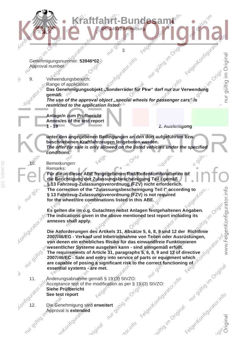 Aufgrund der durchgeführten Prüfungen bestehen keine technischen Bedenken o.g. Sonderräder